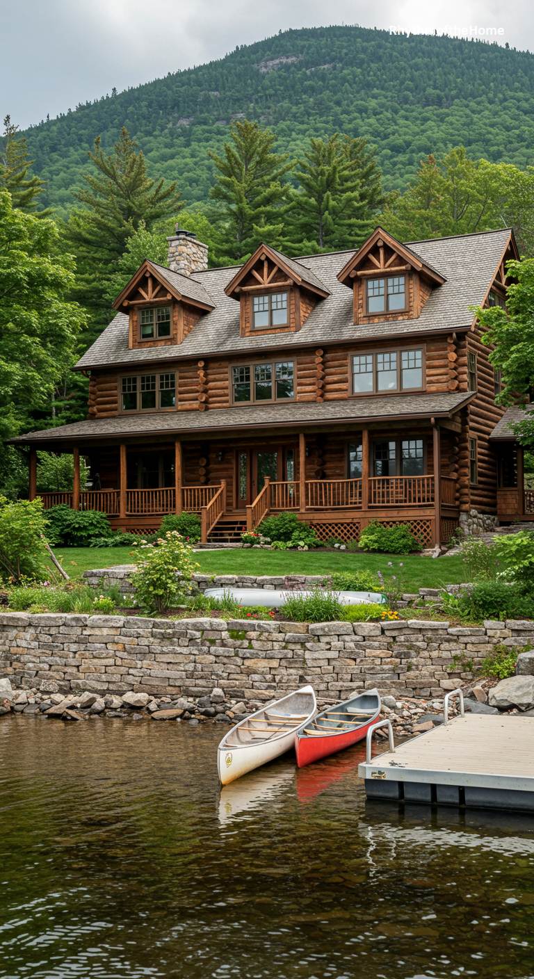 This magnificent log lodge sits gracefully on the shore of a serene lake, ready for adventure. Its multi-story design, with three prominent dormers and a full-length porch, offers ample space and classic lakeside appeal. A beautiful, low stone wall edges the property, meeting the water’s edge where a small wooden dock is moored. A red and a white canoe are tied up, hinting at quiet mornings spent paddling on the calm water. With a backdrop of a densely forested green mountain, this home is the perfect base for a life filled with outdoor recreation and peaceful contemplation.