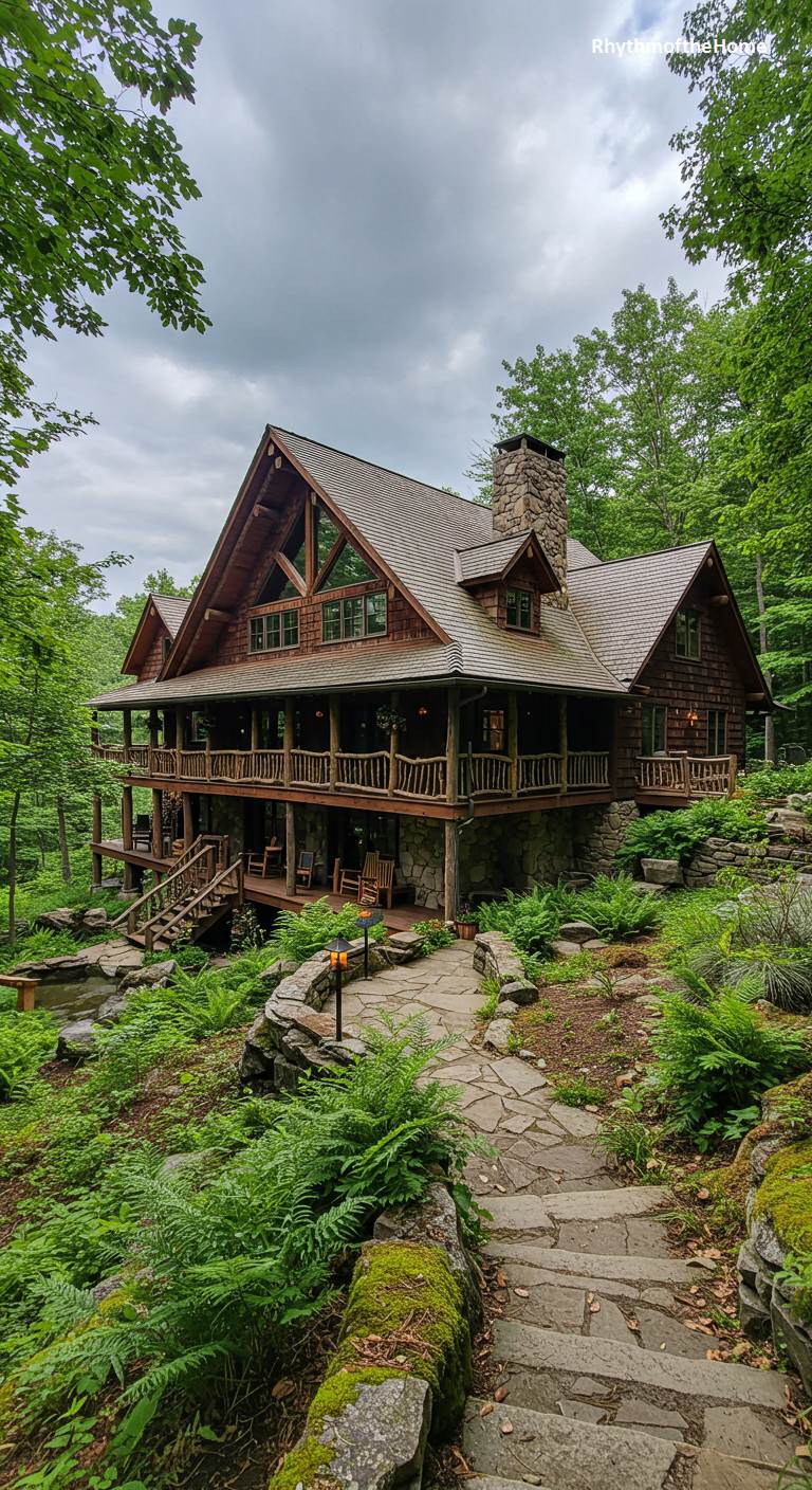 This sprawling, multi-level log home seems to grow organically from its lush, wooded hillside. A winding stone path, flanked by rustic lights, ascends through a sea of vibrant green ferns and moss-covered rocks, leading to the various levels of the house. Extensive, wrap-around porches with natural-form log railings provide abundant space for enjoying the immersive forest setting. The home’s complex roofline and numerous windows suggest a spacious and light-filled interior, creating a luxurious treehouse-like experience deep within the tranquil woods.