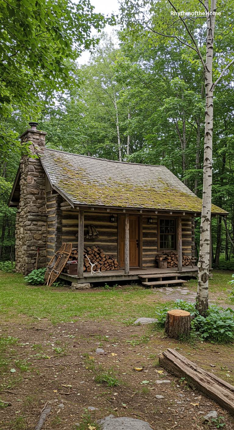 This small, rustic log cabin exudes an air of timeless, pioneer simplicity. Its cedar-shingled roof is covered in a beautiful, soft layer of green moss, making it seem like a natural part of the forest floor. A sturdy stone chimney anchors one end of the cabin, while a simple covered porch offers shelter. Firewood is stacked neatly, and a pair of old-fashioned snowshoes leans against the wall, evoking a sense of self-sufficient living. A single birch tree stands sentinel nearby in the quiet, green woods. This is a humble and profoundly peaceful woodland hermitage.