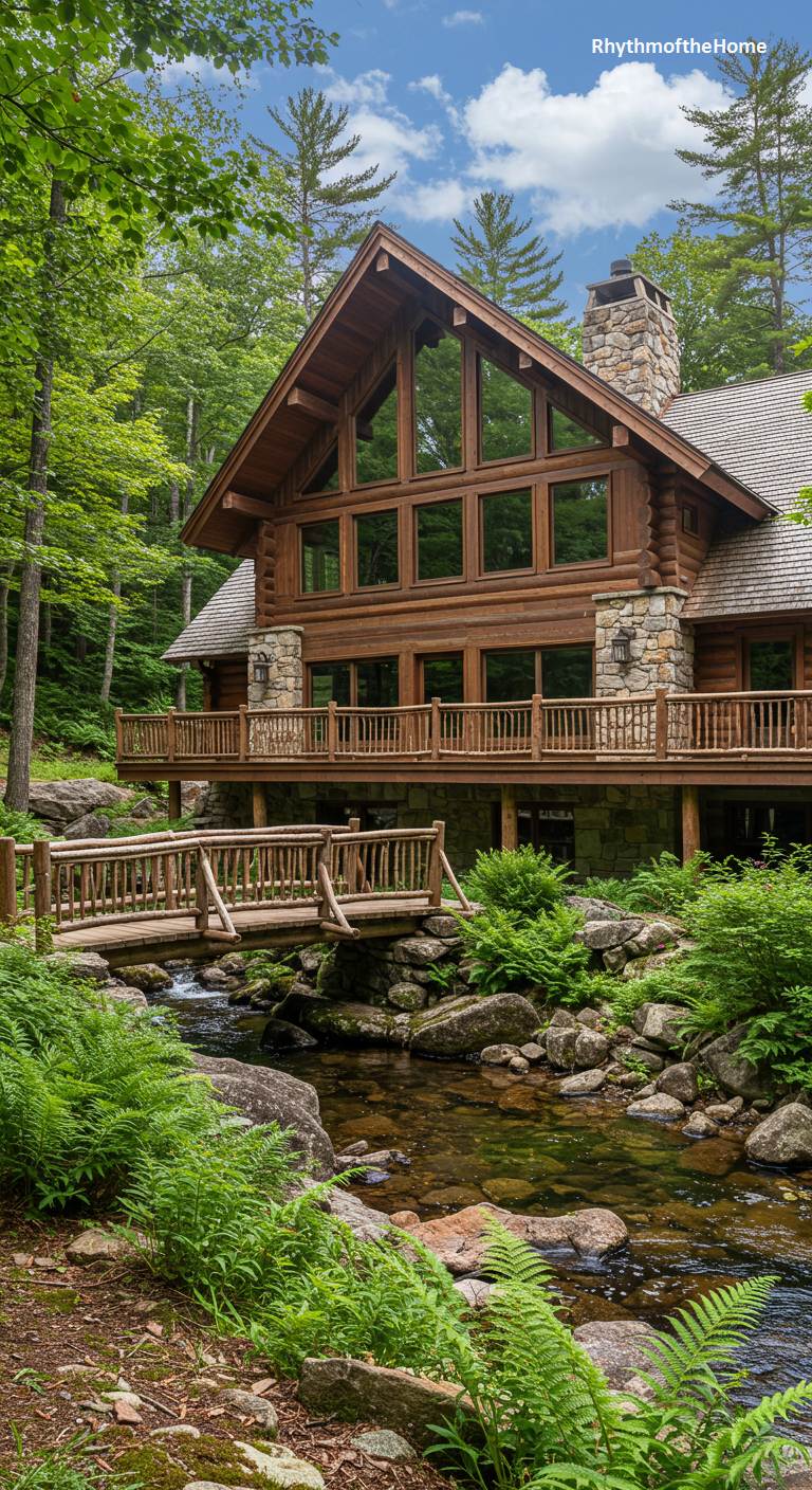 This stunning timber-frame lodge is a masterpiece of rustic architecture, perfectly integrated into its wild, streamside setting. A charming wooden bridge crosses a rushing creek, leading directly to the home’s welcoming deck. The house itself features a massive wall of windows that floods the great room with light and offers incredible views of the surrounding forest. The combination of large logs, stone pillars, and lush, fern-filled undergrowth creates a magical, almost ethereal atmosphere. This is a true sanctuary, where the sounds of the forest and the flowing water provide a constant, soothing soundtrack.