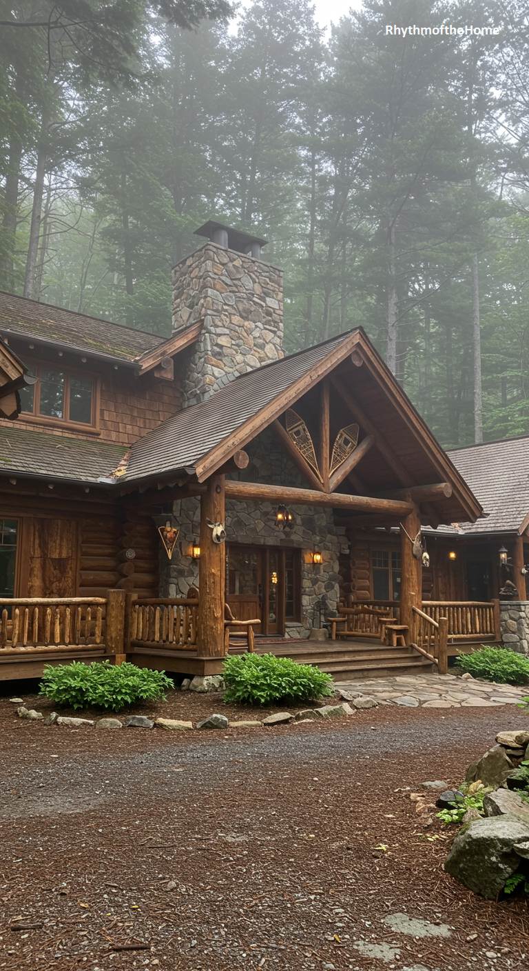 On a misty, foggy morning, the warm lights of this grand log lodge offer a welcoming beacon in the deep woods. The entrance is a powerful statement of rustic design, with a massive timber-frame portico supported by stout log pillars. Carved snowshoes hang in the gable as a decorative touch. The sprawling layout, with its long porch and multiple wings, speaks to a place built for hospitality and gathering. The damp gravel driveway and lush green shrubs complete a scene that is rich in atmosphere, suggesting a cozy refuge from the cool, damp mountain air.