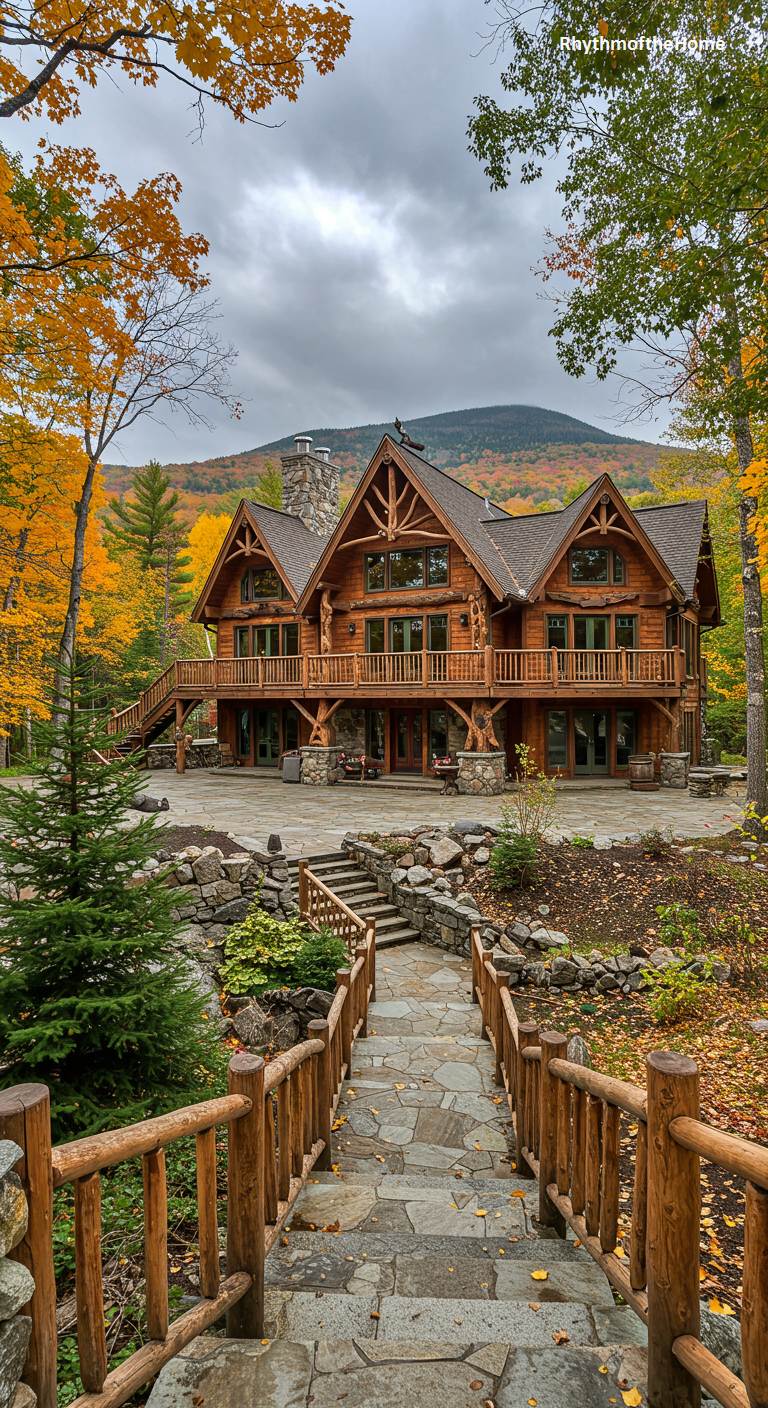 This magnificent log home is perfectly positioned to capture the breathtaking beauty of an autumn forest. A stone and log staircase, flanked by a rustic wooden railing, descends toward the viewer, creating a grand and welcoming approach. The trees surrounding the home are a riot of fall colors—fiery oranges, brilliant yellows, and deep greens. The house itself, a sprawling timber-frame masterpiece with multiple gables and a vast deck, seems to be celebrating the season along with the landscape. With a mountain visible in the distance, this is a picture of luxurious living at the peak of autumn’s splendor.