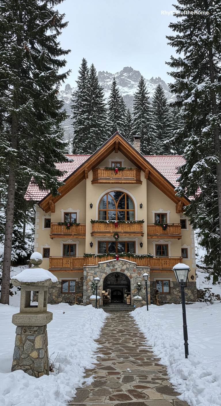 Nestled amongst snow-laden pines with a backdrop of jagged alpine peaks, this beautiful mountain home is the embodiment of traditional Austrian charm. Its pale stucco facade is cheerfully accented with carved wooden balconies, window boxes, and a welcoming, arched stone entryway. Christmas wreaths add a festive touch, hinting at holiday cheer and warmth inside. The red-tiled roof, lightly dusted with snow, provides a vibrant contrast to the wintery scene. A stone-paved path, cleared of snow, leads invitingly to the front door, promising refuge and gemütlichkeit in a breathtakingly beautiful setting. A stone lantern in the foreground adds a touch of oriental grace to this European classic.