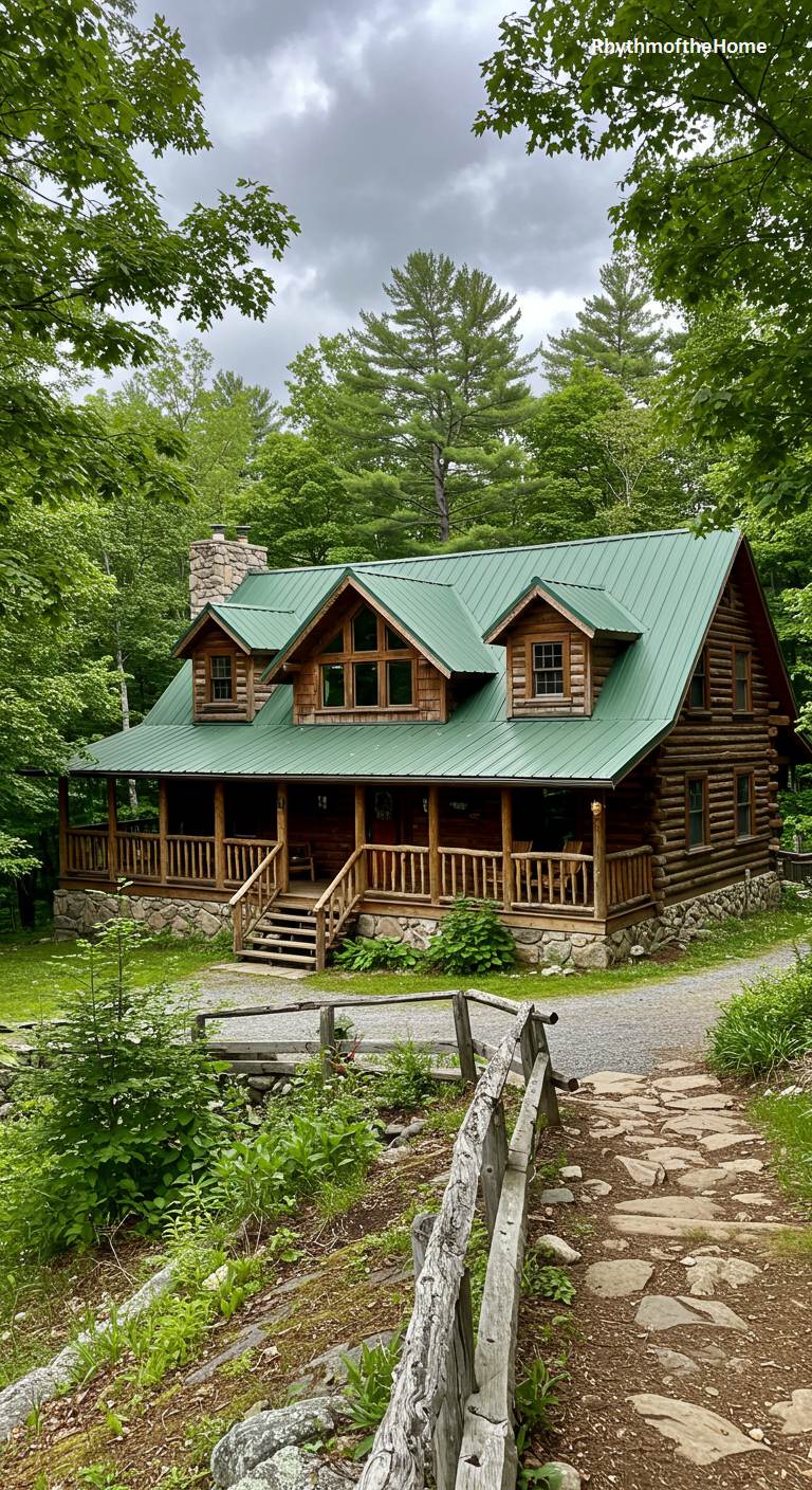 This classic log cabin, with its cheerful green metal roof, is a charming sight in a lush, green woodland setting. A full-length covered porch, complete with rustic railings and a porch swing, invites leisurely afternoons. The three dormer windows on the upper level add character and light to the upstairs rooms. A split-rail fence and a simple stone-and-dirt path wind through the property, enhancing its rustic, country feel. Surrounded by dense summer foliage, this home is a picture of peaceful, comfortable living in deep connection with nature.