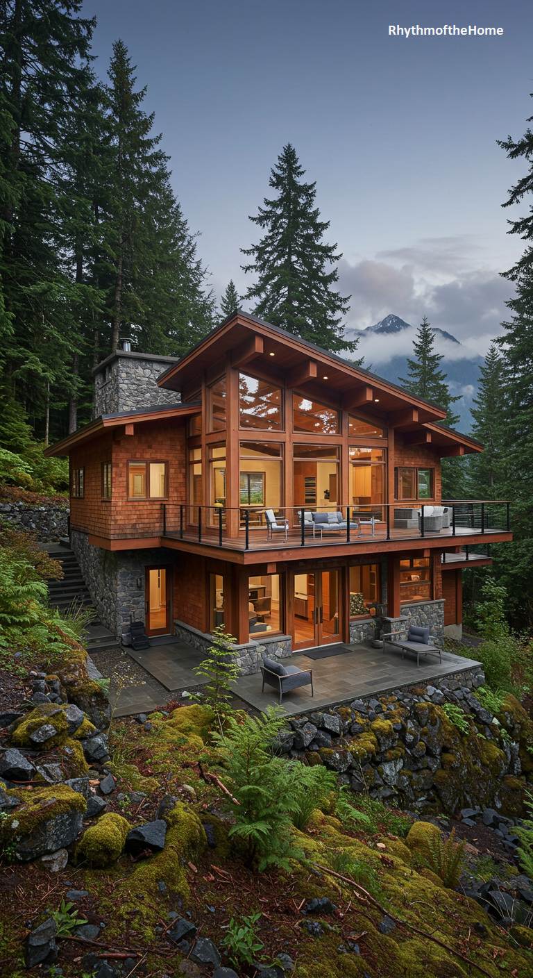 Perched dramatically on a rocky, moss-covered cliff, this modern home is a stunning blend of architectural prowess and natural beauty. Its design features a mix of warm wood siding, a strong stone base, and large glass windows that capture the breathtaking views. The multi-level structure includes an upper balcony and a lower patio, providing ample space to experience the immersive forest setting. As dusk settles, the warm interior lights create a welcoming glow, contrasting beautifully with the cool tones of the evening sky and the distant, cloud-shrouded peak. This is a sophisticated and serene mountain escape.