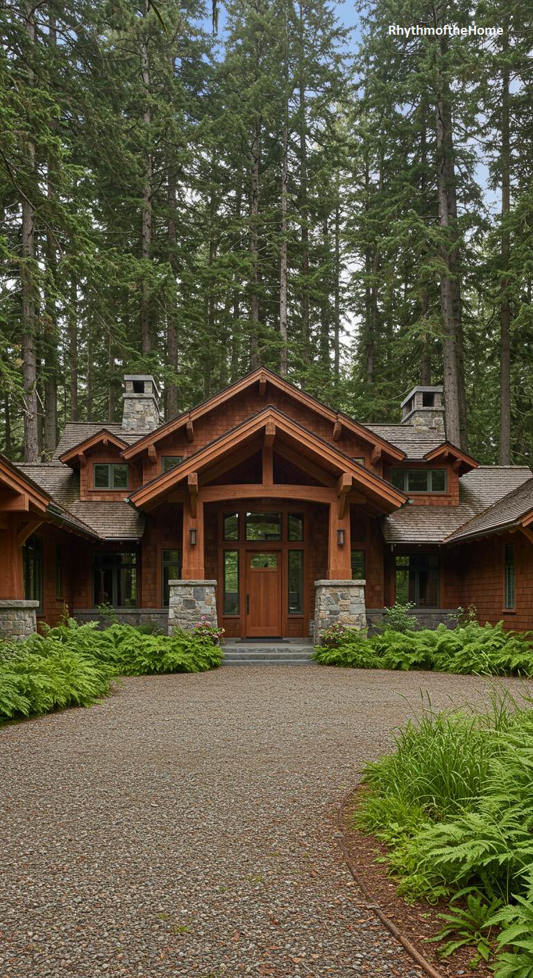 The approach to this exquisite Craftsman-style mountain home is a journey through a verdant, fern-filled forest. A gravel driveway leads to a grand, timber-framed entryway that exudes warmth and quality. The home’s rich, brown wood shingle siding and stone pillar bases help it merge beautifully with the tall pines and lush undergrowth that surround it. The entire scene is one of tranquil, understated luxury, a private sanctuary where the architecture is designed to complement and celebrate the majestic beauty of the Pacific Northwest forest.
