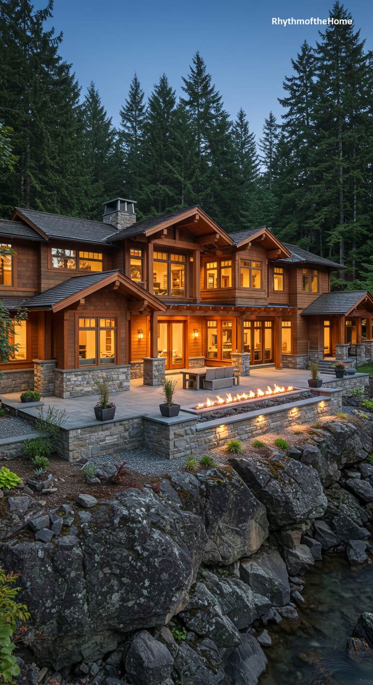 As evening descends, this magnificent lodge becomes a beacon of warmth and luxury on the banks of a river. The extensive flagstone patio is designed for elegant entertaining, featuring a long, linear fire pit that casts a flickering glow on the seating area. The home itself is a masterpiece of rustic architecture, with multiple gables, warm wood siding, and robust stone pillars. The lights from within create an inviting ambiance, while the rocky riverbank and the dark forest beyond provide a stunning natural backdrop. This is a five-star retreat designed for comfort and communion with nature.