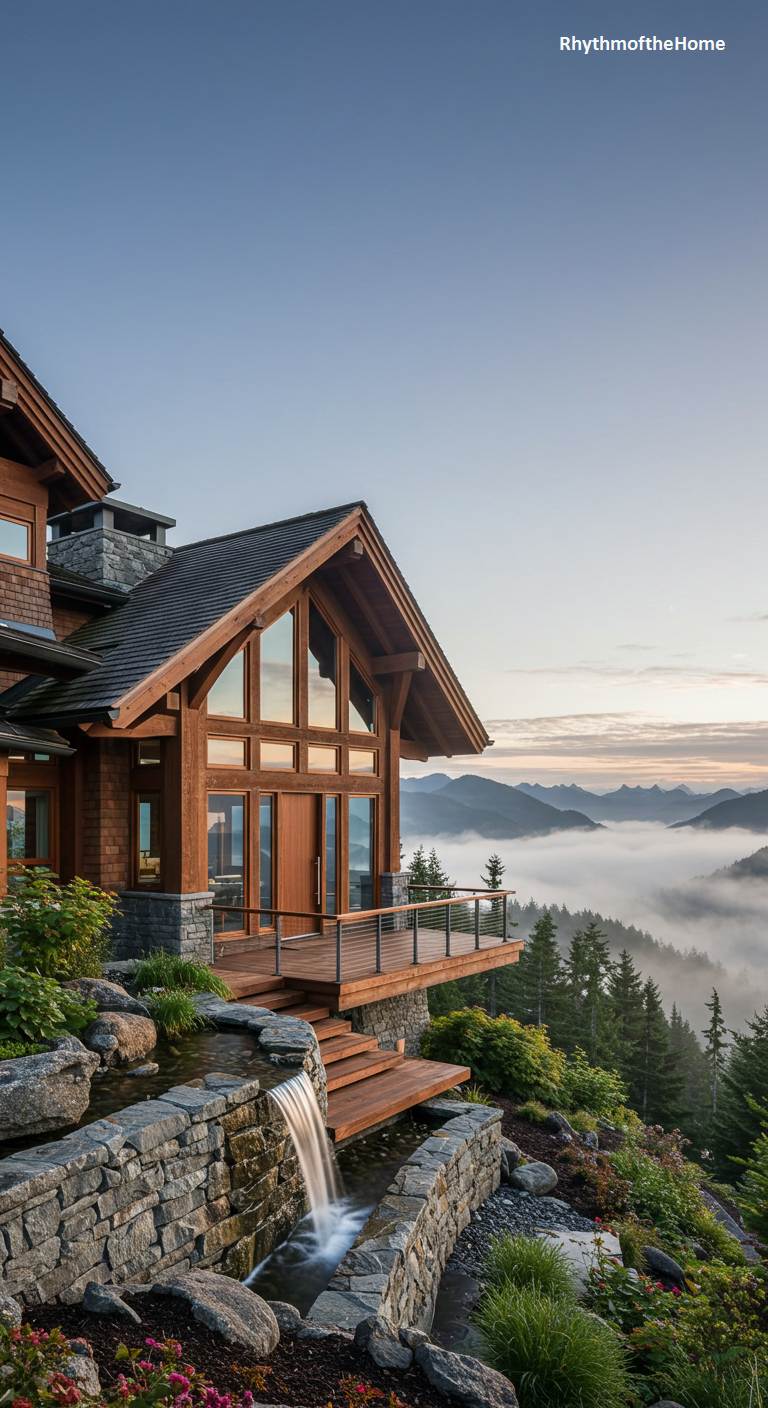 This stunning mountain home offers a view that is nothing short of magical. Perched on a high ridge, its timber-framed deck provides a front-row seat to a valley filled with a sea of rolling fog. In the foreground, a beautifully crafted waterfall, part of a tiered stone water feature, cascades gently, its sound adding to the serene atmosphere. The home’s architecture, with its large A-frame window, is designed to maximize this breathtaking vista. As the sun begins to rise, this home feels like a sanctuary floating above the clouds, a place of unparalleled peace and beauty.