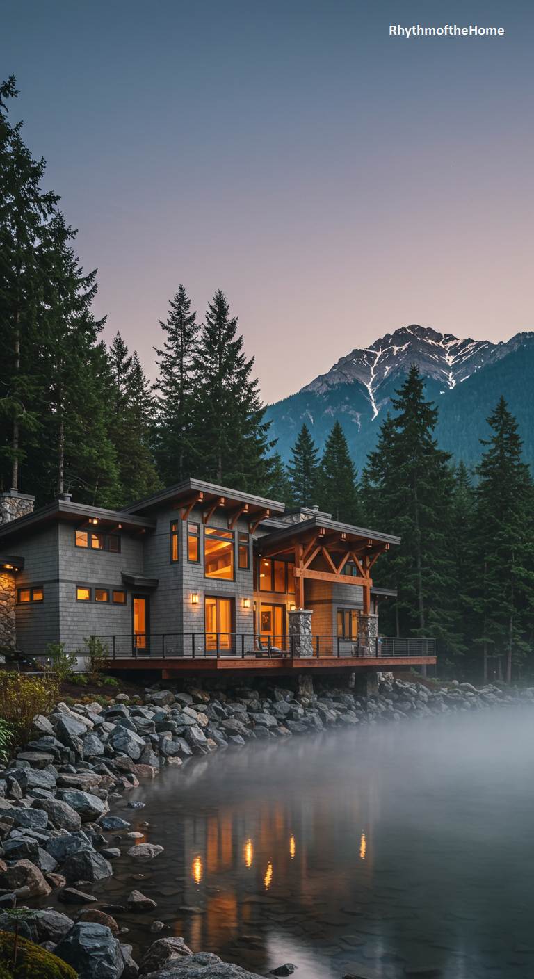 At the edge of a tranquil lake, with mist rising from the cool water, this modern mountain home is a picture of serene beauty. The grey shingle siding and dark trim are complemented by warm, heavy timber framing, blending contemporary and rustic styles. The warm lights from the large windows reflect in the water, creating a soft, ethereal glow. In the distance, a snow-capped mountain stands sentinel against the pale pre-dawn sky. This is a home designed for quiet moments, offering a peaceful and deeply atmospheric connection to the water and the mountains.