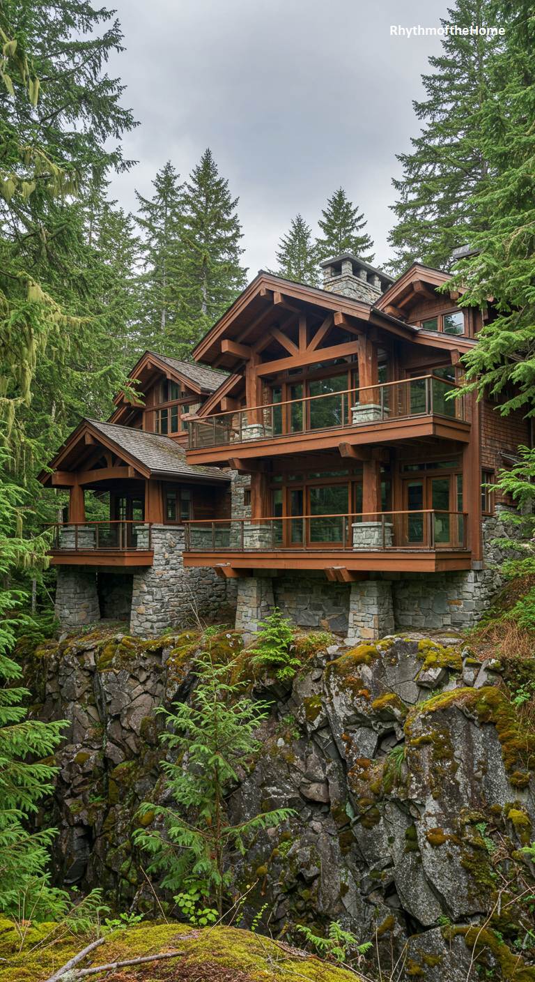 This impressive wooden home is built with formidable strength and grace upon a sheer rock cliff. Supported by massive stone pillars, its multiple levels of decks and balconies seem to float amongst the tall, moss-laden trees of the Pacific Northwest. The rich, warm tones of the wood stand out against the deep greens and greys of the forest and rock. This is a bold architectural statement, a luxurious, treehouse-like structure that offers a truly immersive and breathtaking experience of living on the edge of the wild.