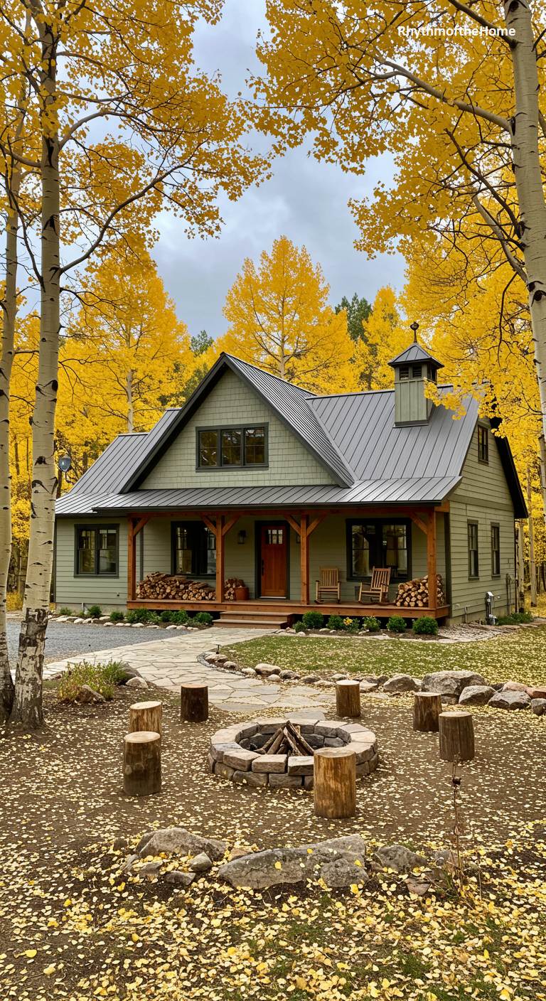 Surrounded by a golden halo of aspen trees in their peak autumn glory, this mountain home is a vision of pastoral charm. The sage-green siding and dark metal roof create a modern farmhouse aesthetic that is both stylish and cozy. A welcoming front porch, complete with rocking chairs and stacks of firewood, speaks of crisp evenings and warm cider. In the foreground, a stone-lined fire pit with log stools awaits a gathering of friends and family under the grey sky. The ground is a carpet of fallen yellow leaves, making this home feel like the very heart of the autumn season.