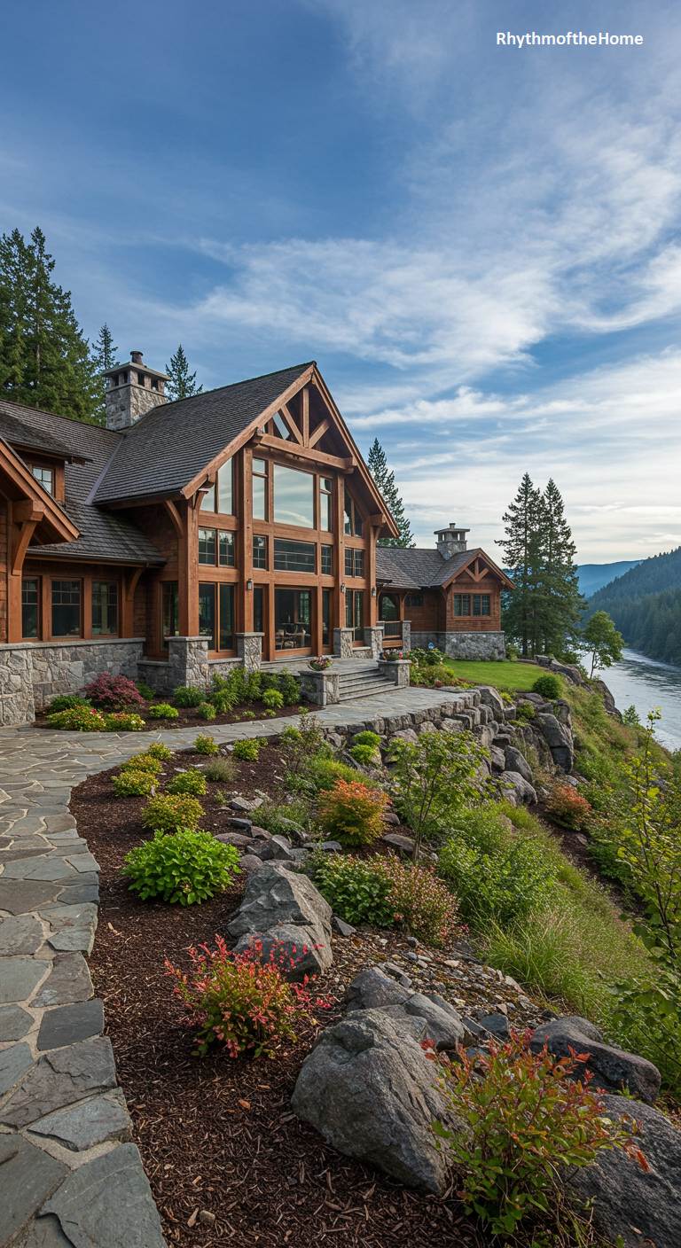 This grand timber-frame home commands a spectacular position on a high bluff overlooking a wide, flowing river. A winding flagstone path meanders through beautifully landscaped gardens filled with rocks and hardy shrubs, leading towards the entrance. The house, with its massive A-frame window wall and robust stone accents, is designed to capture the expansive views of the river and the forested hills beyond. Under a vast blue sky with scattered clouds, this home is a luxurious and peaceful estate, offering a front-row seat to the constant, gentle motion of the river below.