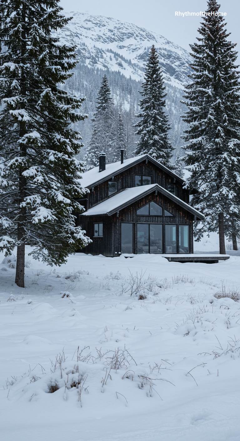 Set against a backdrop of a snow-covered mountain, this dark-clad Nordic home exudes a moody and sophisticated charm. Its black, vertical siding and large, floor-to-ceiling windows create a stark and beautiful silhouette in the pristine winter landscape. The house is nestled amongst snow-laden evergreen trees, its form echoing the triangular shapes of the surrounding pines. This is a home that embraces the drama of the winter landscape, offering a cozy and stylish refuge from which to observe the stark, monochromatic beauty of the north.