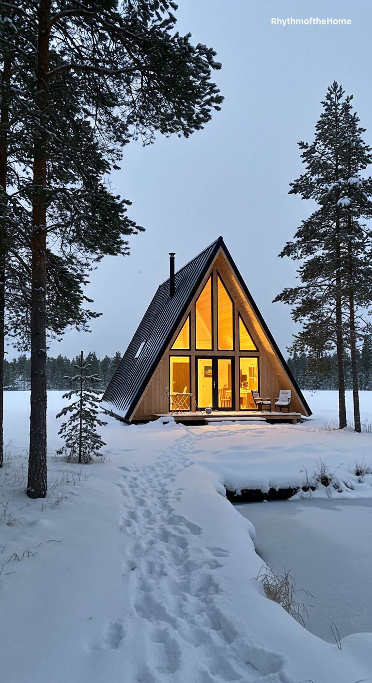 This stunning home reimagines the classic A-frame with a bold, modern aesthetic. The entire front facade is a dramatic wall of glass, framed in black, creating a powerful triangular silhouette against the winter snow. The dark exterior siding provides a stark, beautiful contrast to the pristine white landscape. A gravel path, flanked by minimalist path lights, leads directly to the entrance, its straight line emphasizing the home’s clean geometry. The warm glow from within hints at a minimalist yet cozy interior, making this a striking and sophisticated sanctuary in the heart of a snowy pine forest.