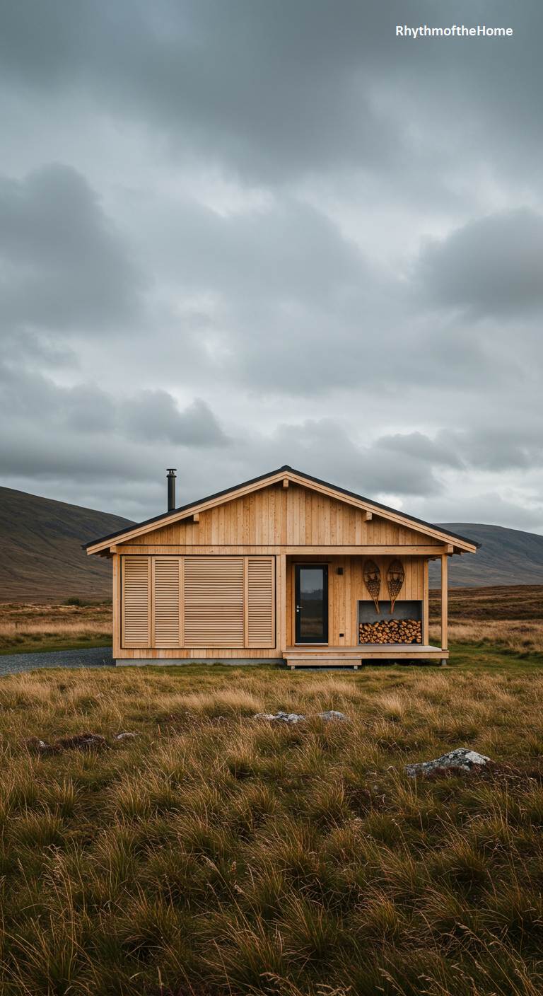 This modern cabin sits with quiet composure in the vast, open expanse of what looks like the Scottish Highlands. Its light, natural wood siding and clean, minimalist design provide a contemporary counterpoint to the rugged, timeless landscape of rolling hills and dramatic, cloudy skies. A sheltered porch nook holds a neat stack of firewood and a pair of decorative snowshoes, adding a touch of rustic utility. The home feels small and self-contained against the immense, grassy moorland, a perfect, solitary outpost for exploring the wild beauty of the highlands.
