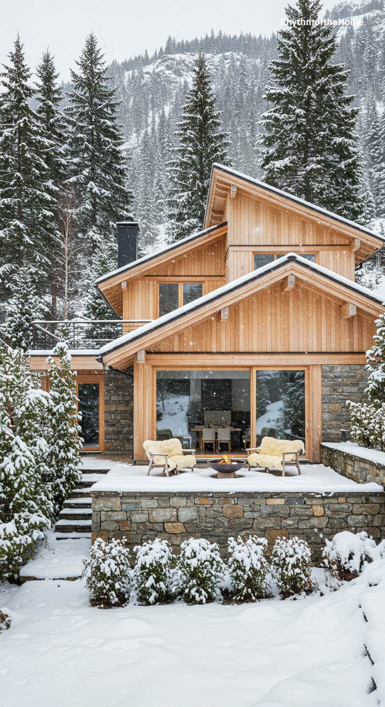 This beautiful alpine chalet is a picture of cozy sophistication in a winter wonderland. A light dusting of snow falls, blanketing the tiered stone patio and the surrounding evergreen trees. The home is a lovely blend of a stone base and light wood siding, with large glass doors opening onto the patio. Two chairs draped in fluffy sheepskins are arranged around a small fire pit, creating an irresistibly inviting scene for enjoying the crisp mountain air. This is a stylish and comfortable retreat where the boundary between indoor luxury and outdoor beauty is elegantly blurred.