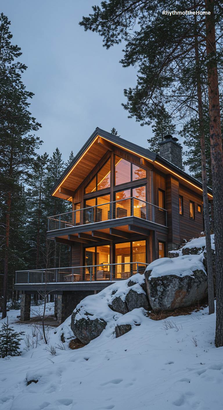 This stunning contemporary home is perfectly designed for a life on the slopes. Its dark siding and prominent timber frame offer a modern take on the classic ski lodge. A wall of windows on the main level provides panoramic views of the snowy landscape, while a second-story balcony offers an even more elevated perspective. The entire structure is built into the hillside, giving it a dynamic, multi-level profile. The warm glow from within promises a cozy and luxurious refuge after a day spent in the crisp, cold air of the surrounding pine forest.