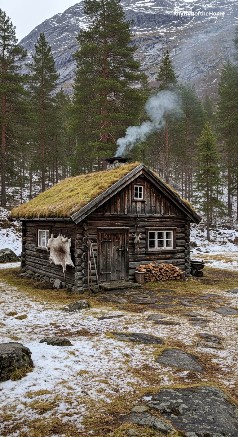 This traditional Norwegian log cabin, or “hytte,” is a timeless image of life in the mountains. Its most captivating feature is the living sod roof, a thick, grassy mat that provides insulation and makes the cabin look like an ancient part of the landscape. Smoke curls from the simple chimney, a sure sign of warmth inside. An animal pelt hangs by the door, and firewood is stacked nearby, speaking to a rustic, self-sufficient lifestyle. Set in a clearing with patches of snow on the ground, this cabin feels authentic, historic, and profoundly peaceful.