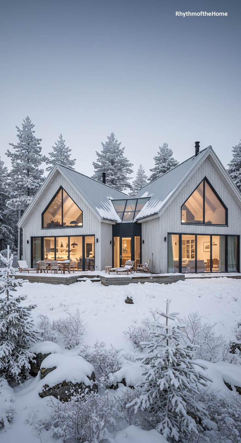 This stunning modern home features a distinctive “V” shape, with two symmetrical gabled wings joined by a central glass entryway. The crisp white siding and dark metal roof create a clean, contemporary aesthetic that stands out beautifully against the snowy, wooded landscape. The large, triangular windows in each gable flood the interior with natural light and provide beautiful views of the winter scenery. This is a thoughtfully designed home that combines a unique architectural form with a cozy, inviting atmosphere, perfect for a modern family retreat.
