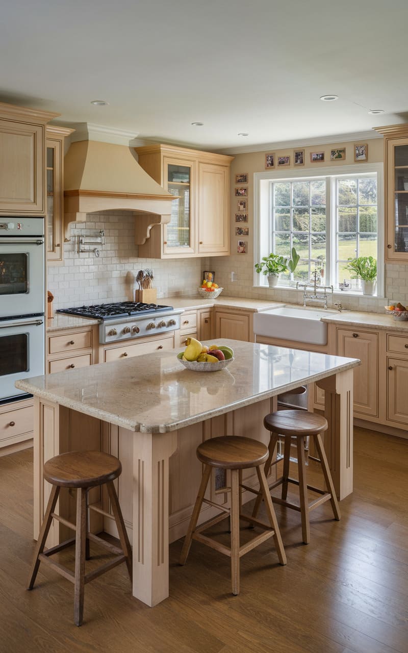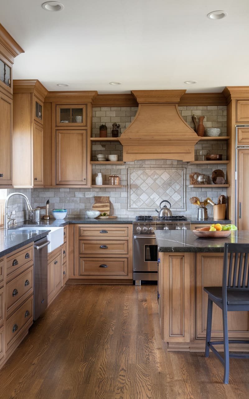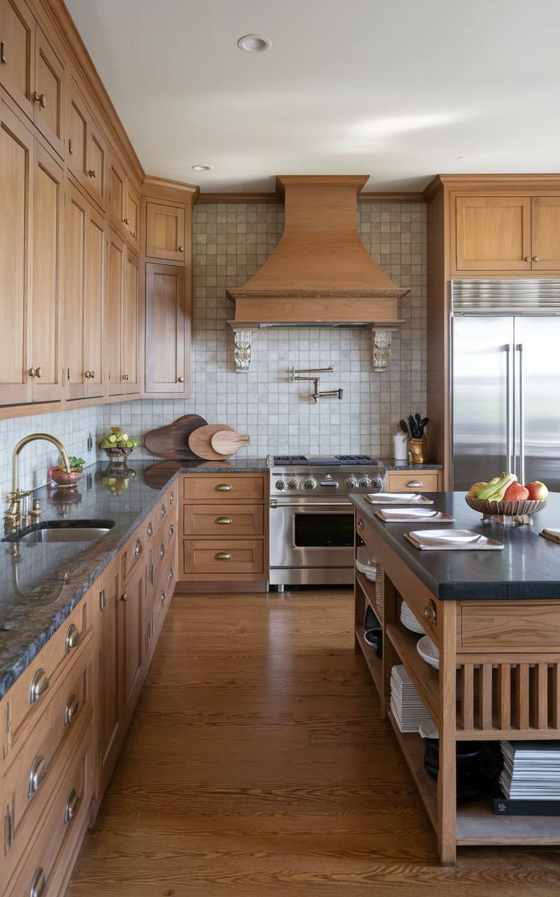 Oak cabinets provide the warm foundation for this traditional family kitchen. A prominent range hood, often clad in matching oak or a contrasting material, creates a focal point. Classic cabinet details like raised panels are common. The layout is designed for family cooking and gathering, often featuring an island. Durable materials ensure the kitchen withstands daily use. This space feels established, comfortable, and ready for family life.