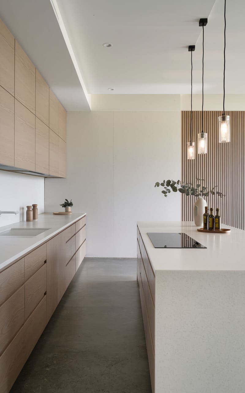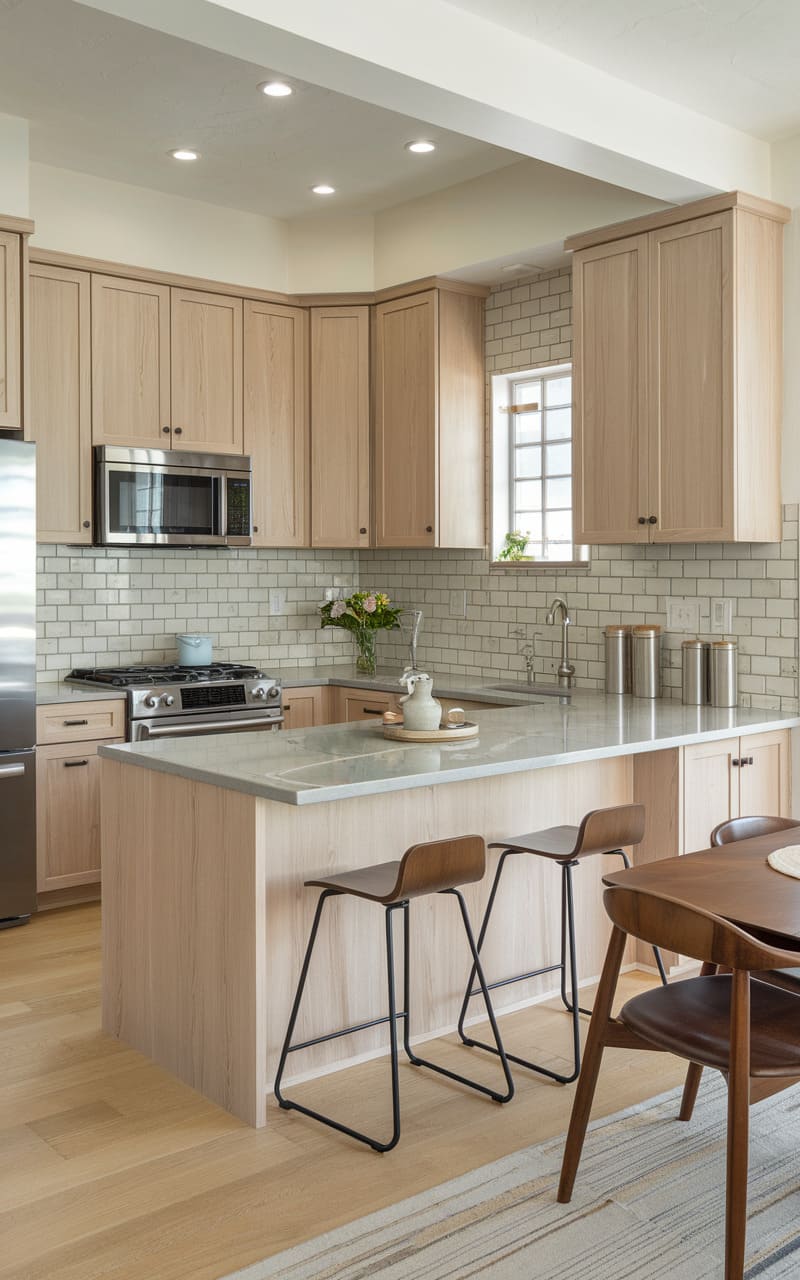 This minimalist kitchen uses light oak cabinets to maintain a serene and clean aesthetic. The neutral color palette throughout the room enhances the calming effect. Flat-panel cabinet doors contribute to the sleek, modern lines. The light wood tone prevents the minimalist design from feeling cold or sterile. Simple, integrated hardware maintains the uncluttered appearance. It’s a peaceful space where functionality meets natural beauty.