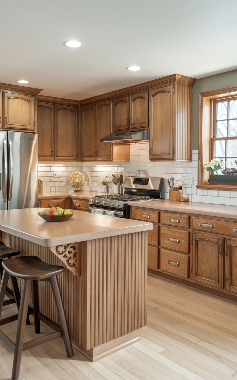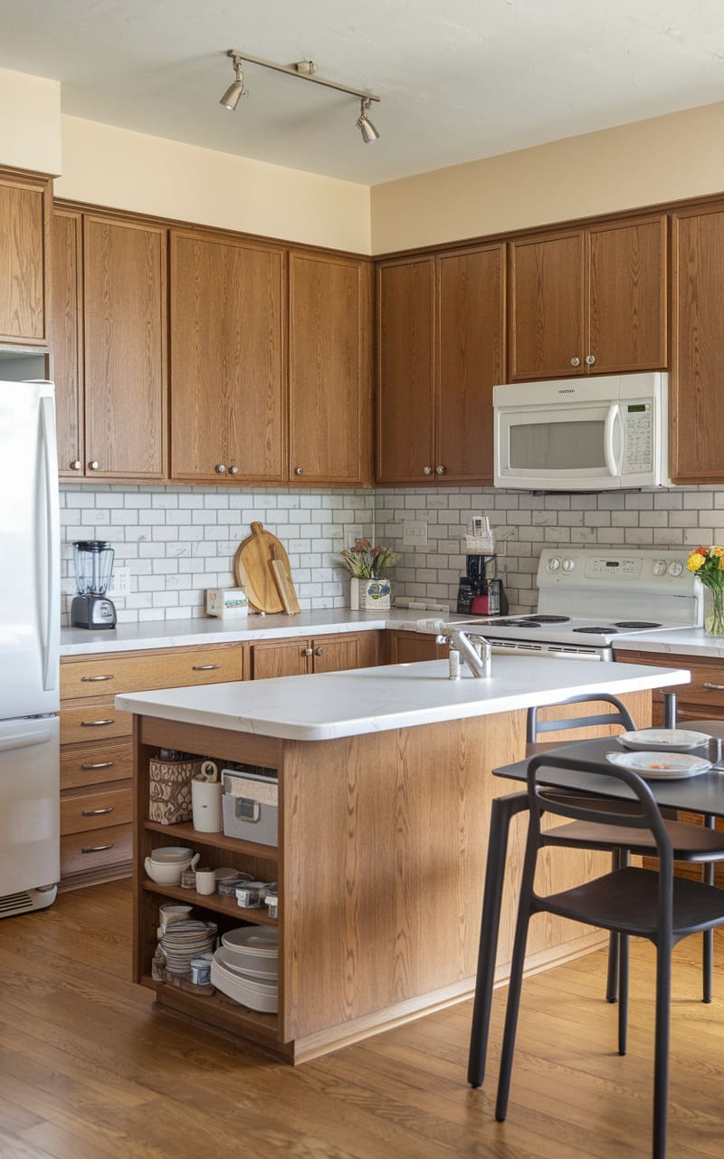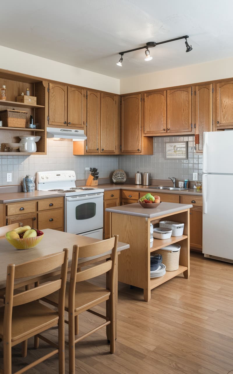 Standard oak cabinets provide a durable and budget-friendly solution for this suburban kitchen. Paired with affordable laminate countertops, the look is practical and functional. A portable kitchen island adds flexible workspace and storage without the cost of built-ins. Simple hardware and standard appliances keep the overall budget in check. This kitchen focuses on essential functionality and making the most of affordable materials. It’s a realistic and achievable design for many homeowners.