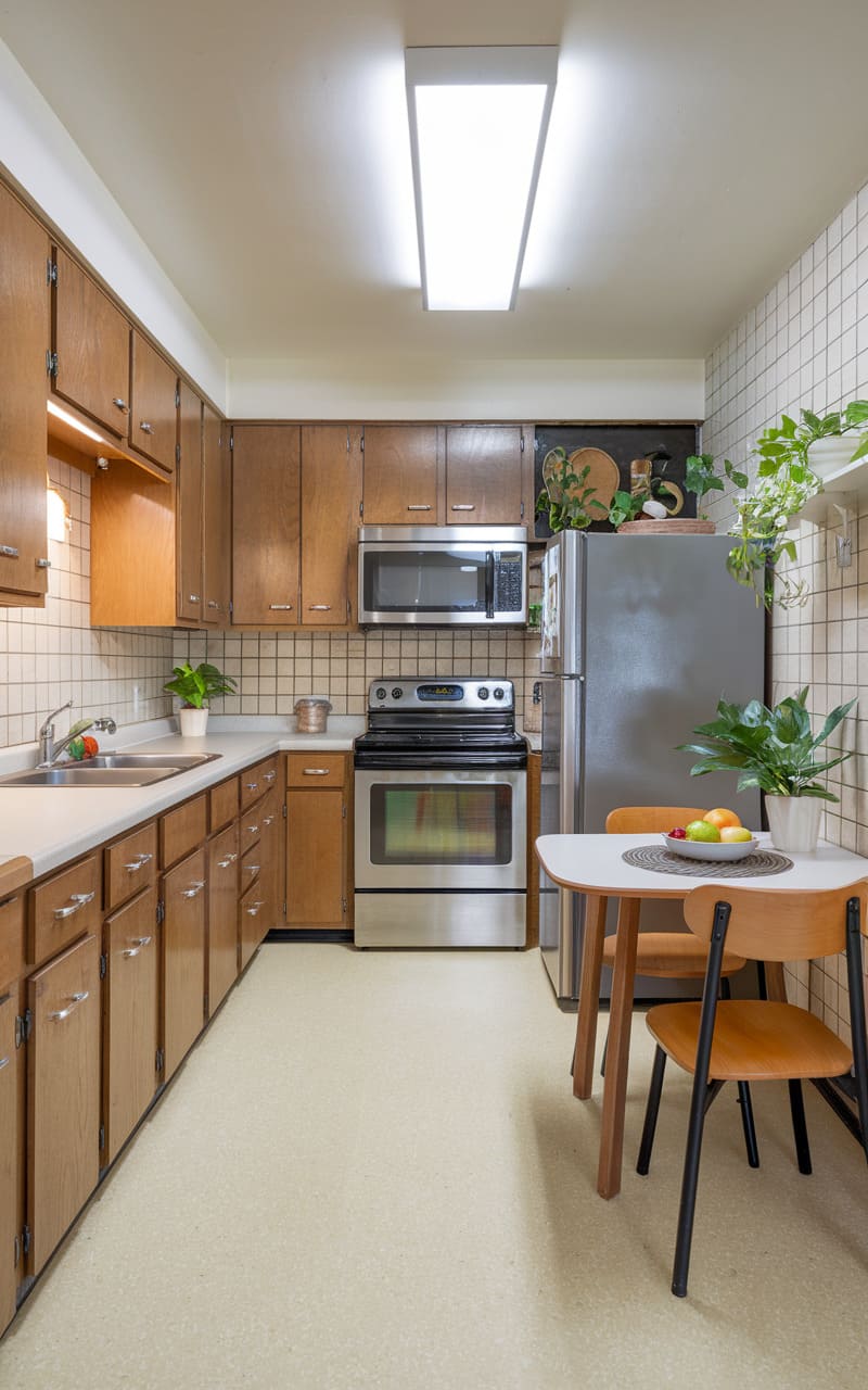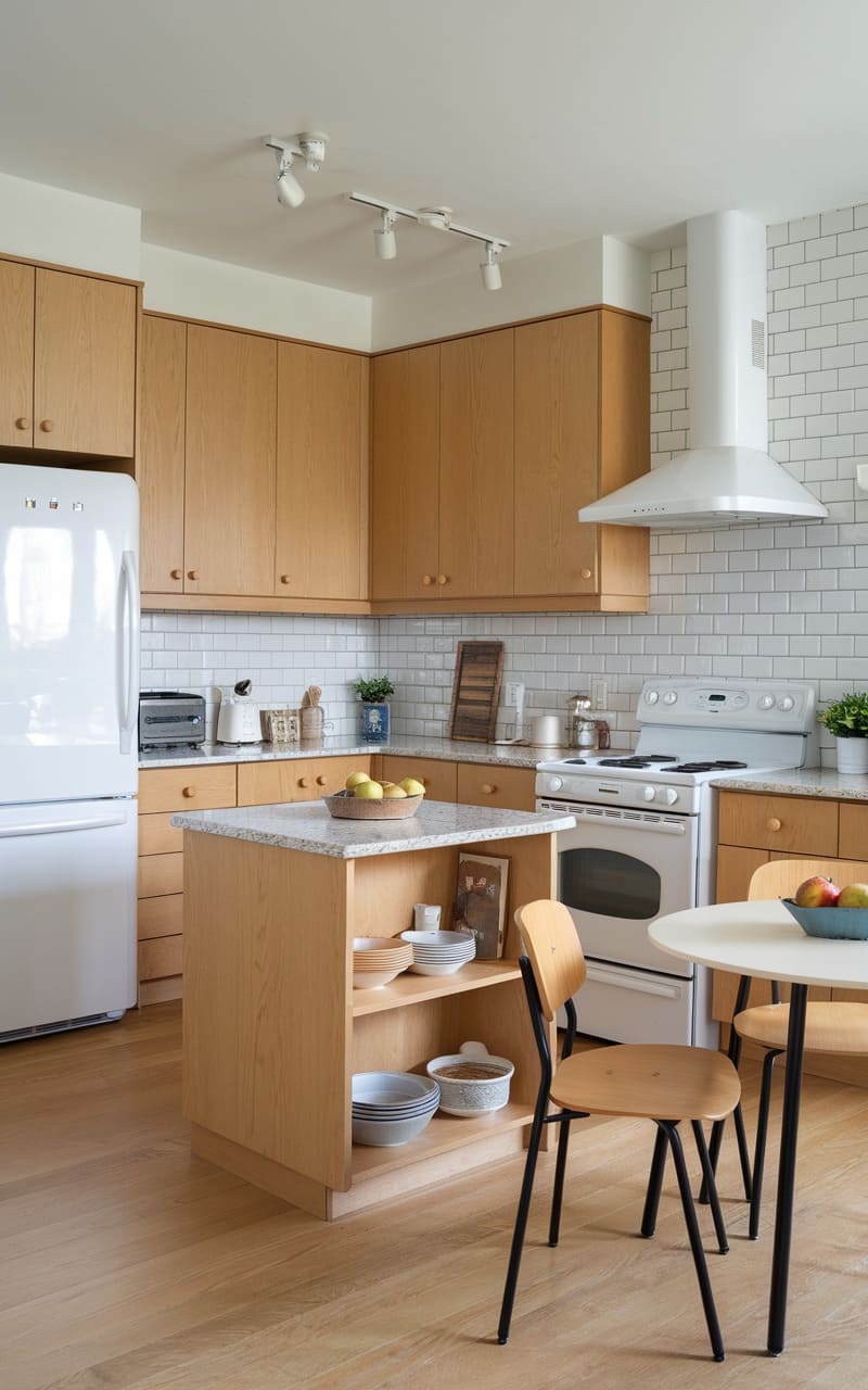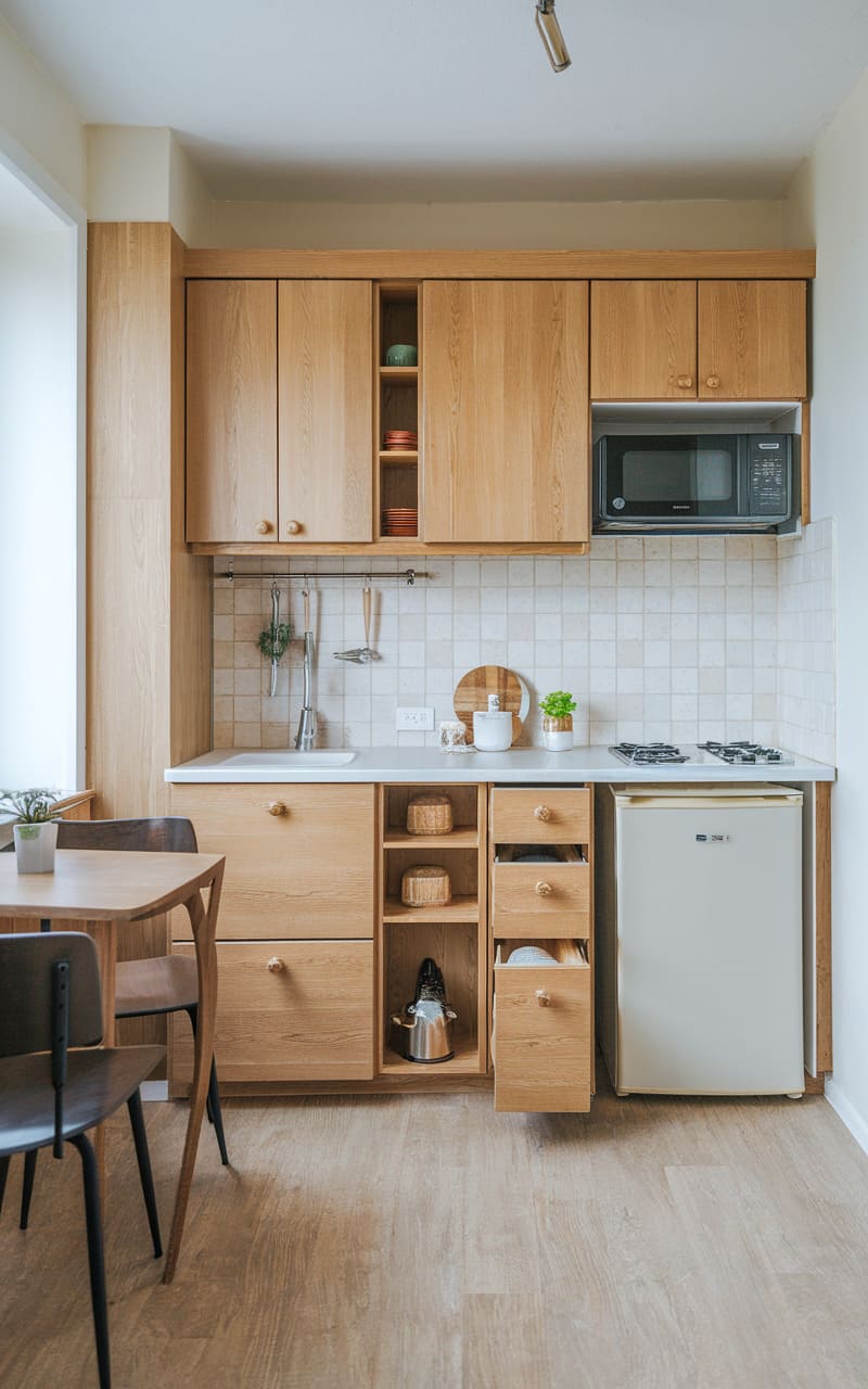Oak cabinets bring warmth and texture to this compact studio apartment kitchen. Using vertical space effectively with tall cabinets maximizes storage in the small footprint. Light-colored oak prevents the limited area from feeling closed in. Integrated appliances help maintain a seamless and uncluttered look. Smart organizational solutions inside the cabinets are key to functionality. This kitchen proves that even tiny spaces deliver style and efficiency.