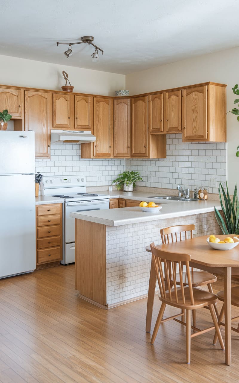 41. Small Family Kitchen With Subway Tiles and Oak Cabinets