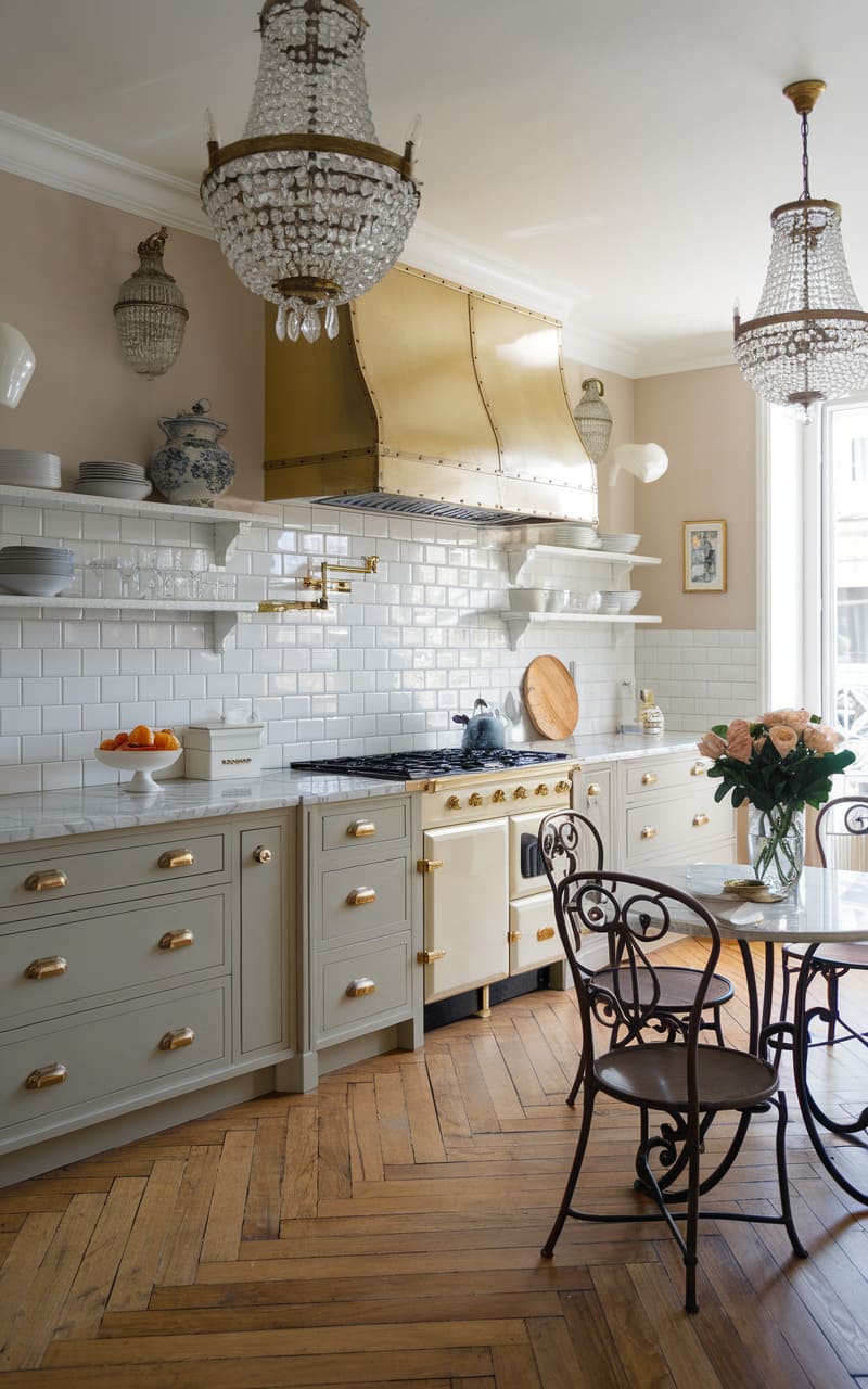 Painting oak cabinets a light sage green transforms this kitchen with Parisian charm. The soft color adds elegance and pairs beautifully with the wood’s texture. Ornate hardware and perhaps some glass-fronted doors enhance the sophisticated style. Marble or butcher block countertops complement the painted cabinets perfectly. Decorative elements like a vintage-style faucet add to the French aesthetic. This kitchen feels chic, romantic, and distinctly European.