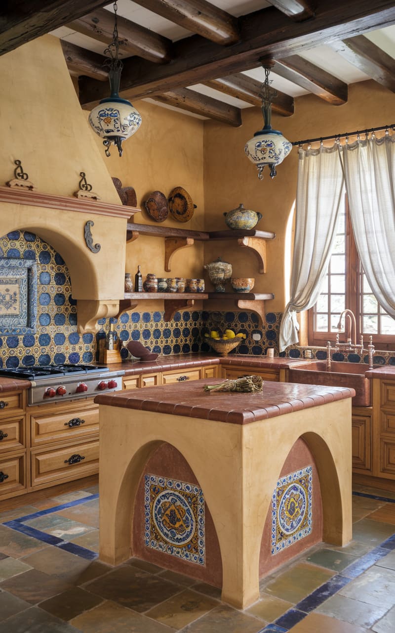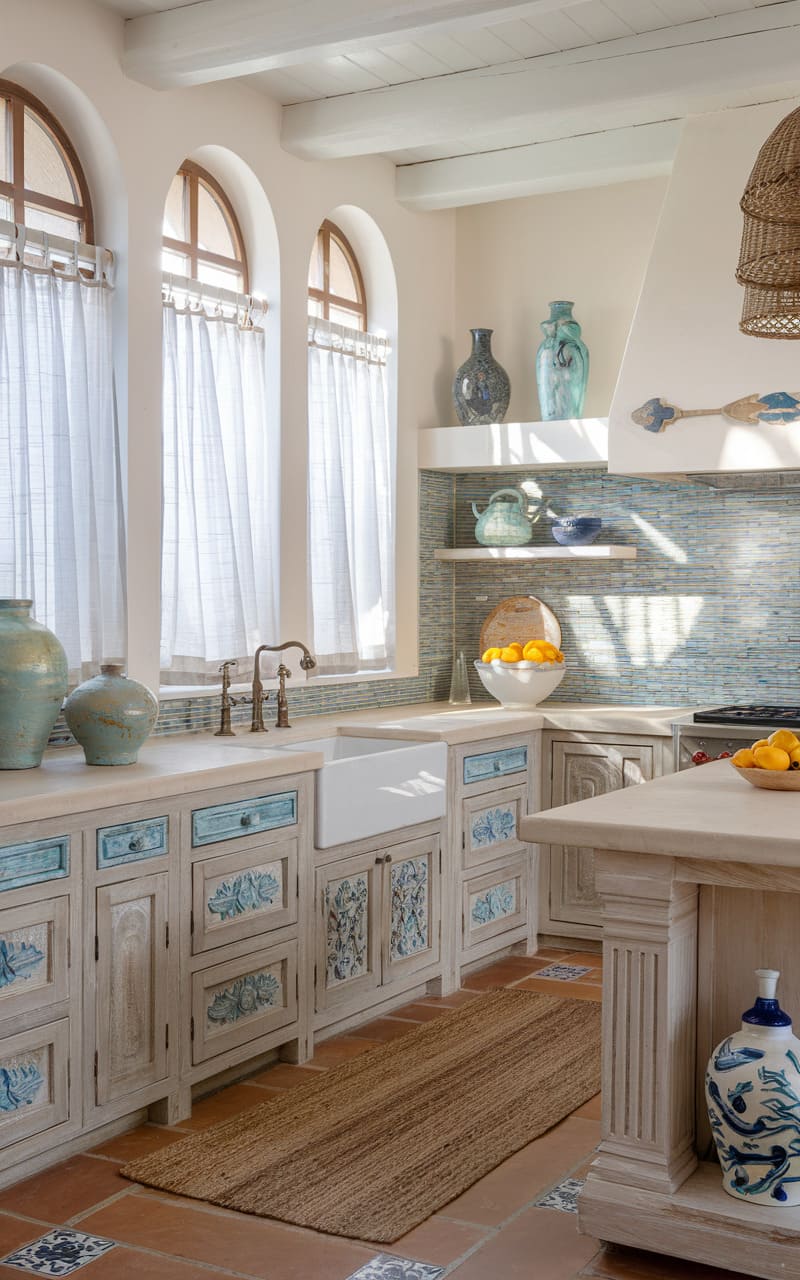 Warm oak cabinets capture the rustic elegance of a Mediterranean villa kitchen. The wood tones pair perfectly with characteristic elements like terracotta tiles and textured walls. Colorful patterned tiles used as a backsplash add vibrancy and regional flair. Wrought iron hardware and light fixtures provide authentic detailing. An overall feeling of warmth, sunshine, and relaxed living defines this space. This kitchen invites leisurely cooking and lively gatherings.