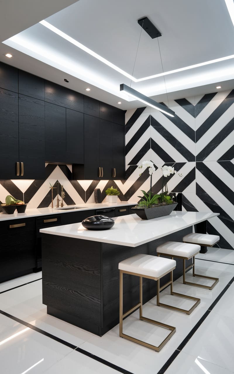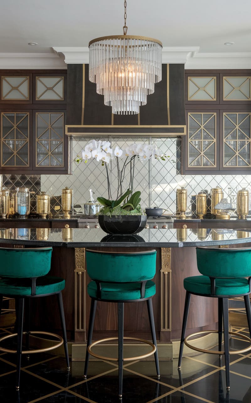 Oak cabinets painted a rich, dark brown provide an opulent base for this Art Deco kitchen. The deep color exudes luxury and sophistication. Geometric patterns in the backsplash or flooring are key Art Deco elements. Metallic accents in gold or brass, especially in hardware and lighting, enhance the glamorous feel. Streamlined cabinet forms nod to the era’s modernism while the color keeps it rich. This kitchen is a stylish throwback to the Roaring Twenties.
