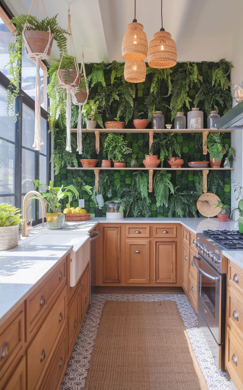 Medium-toned oak cabinets provide a natural backdrop for a stunning preserved moss wall feature. The earthy green of the moss contrasts beautifully with the warm wood tones. This biophilic design element brings the outdoors inside in a unique way. Simple cabinet styles ensure the moss wall remains the focal point. Natural materials like wood and stone elsewhere in the kitchen complement the organic theme. This space feels vibrant, fresh, and connected to nature.
