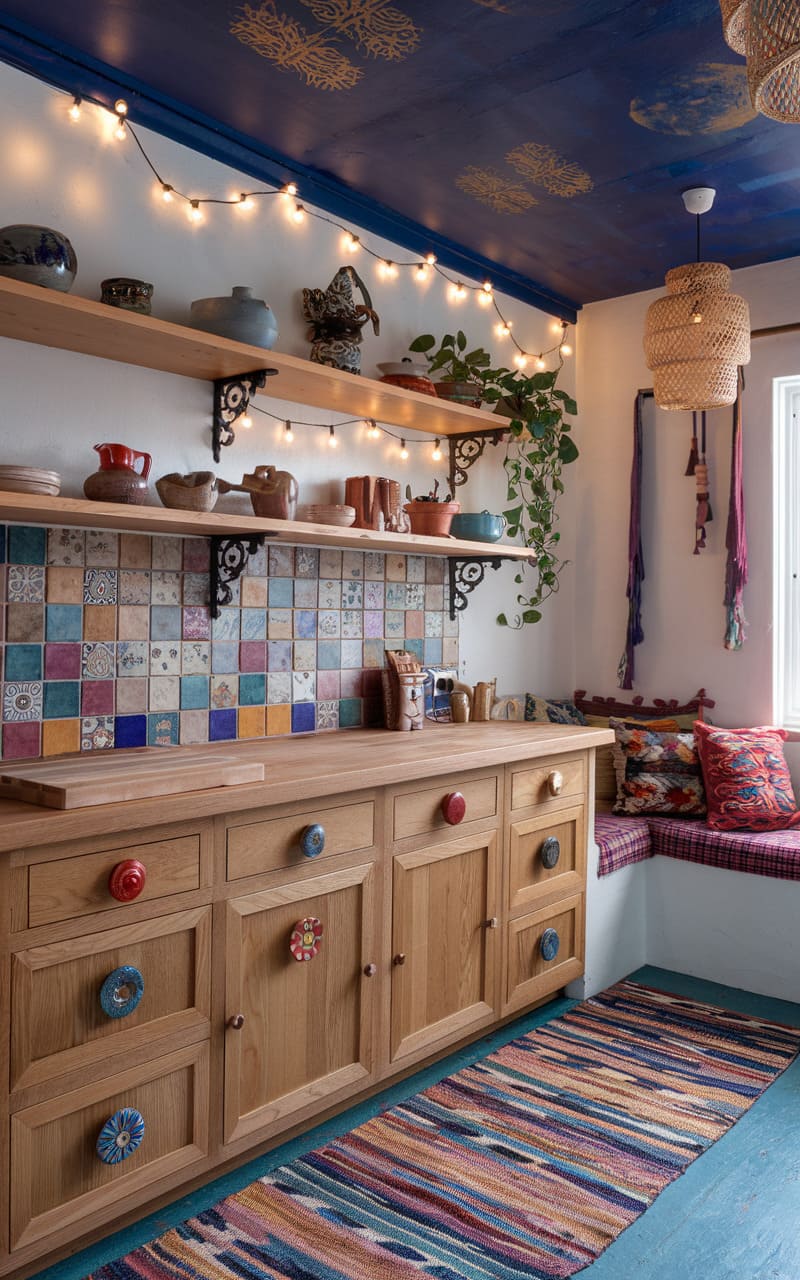 Oak cabinets offer a grounded, natural element in this eclectic bohemian kitchen. The look is enhanced by a dramatically painted ceiling, perhaps in a deep jewel tone or featuring a pattern. Open shelving displays a mix of colorful pottery and vintage finds. Layered rugs and textiles add texture and warmth to the space. The warm oak balances the vibrant colors and patterns elsewhere. This kitchen is a creative haven, full of personality and free spirit.
