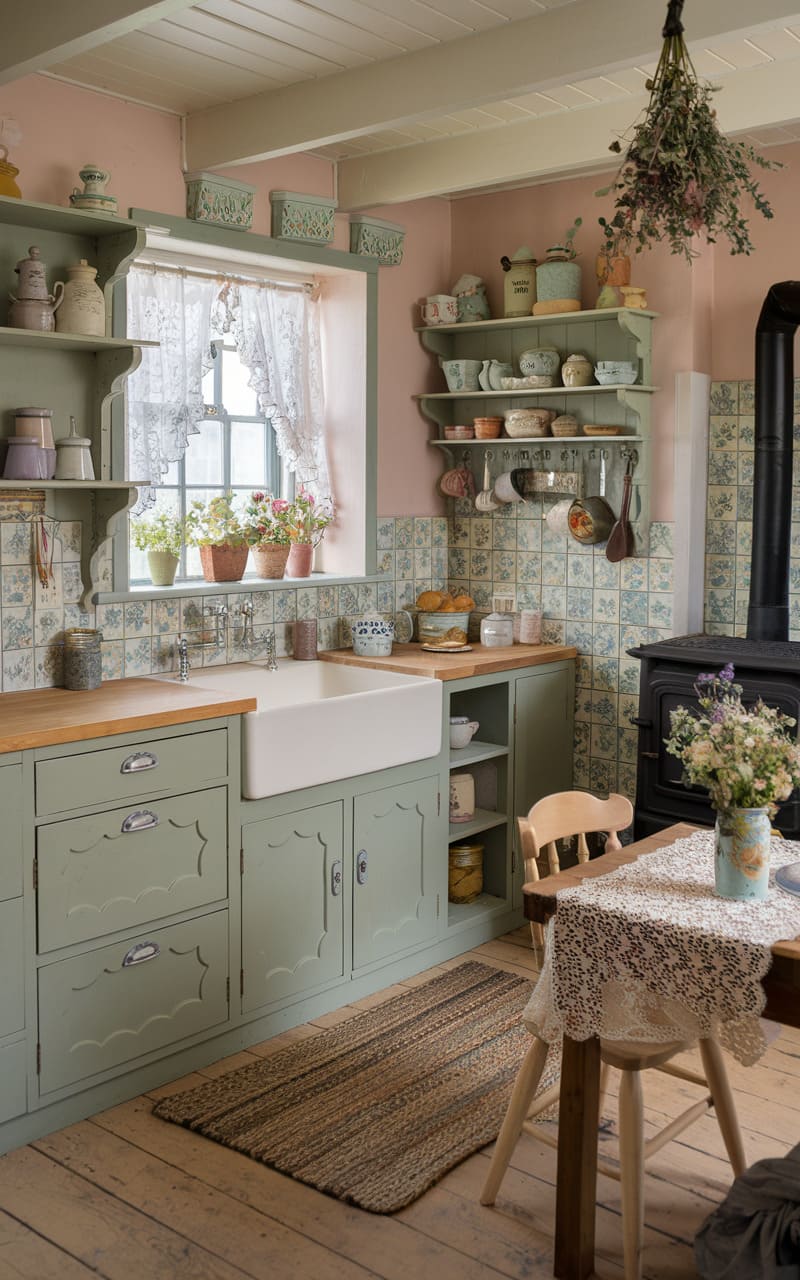 Oak cabinets painted a soft sage green bring enchanting English cottage charm to this kitchen. The gentle color feels calming and connects the space to nature. Simple cabinet styles, like Shaker or beadboard, fit the cottage aesthetic. Butcher block countertops or simple ceramic tiles complement the painted cabinets. Displaying floral china or vintage kitchenware adds to the cozy feel. This kitchen is quaint, inviting, and full of storybook appeal.