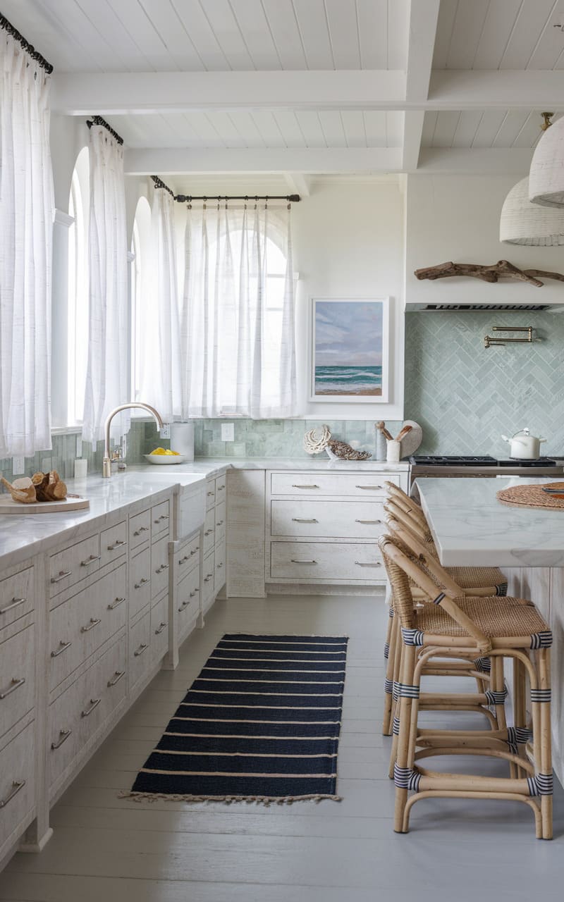 Whitewashed oak cabinets give this coastal kitchen a light, weathered look. The finish allows the wood grain to show through, adding texture and character. This style evokes the feel of sun-bleached wood found by the sea. Pairing the cabinets with light blue or seafoam green accents enhances the coastal vibe. Simple hardware keeps the focus on the cabinet finish. This kitchen feels airy, relaxed, and perfectly suited for a beach house.