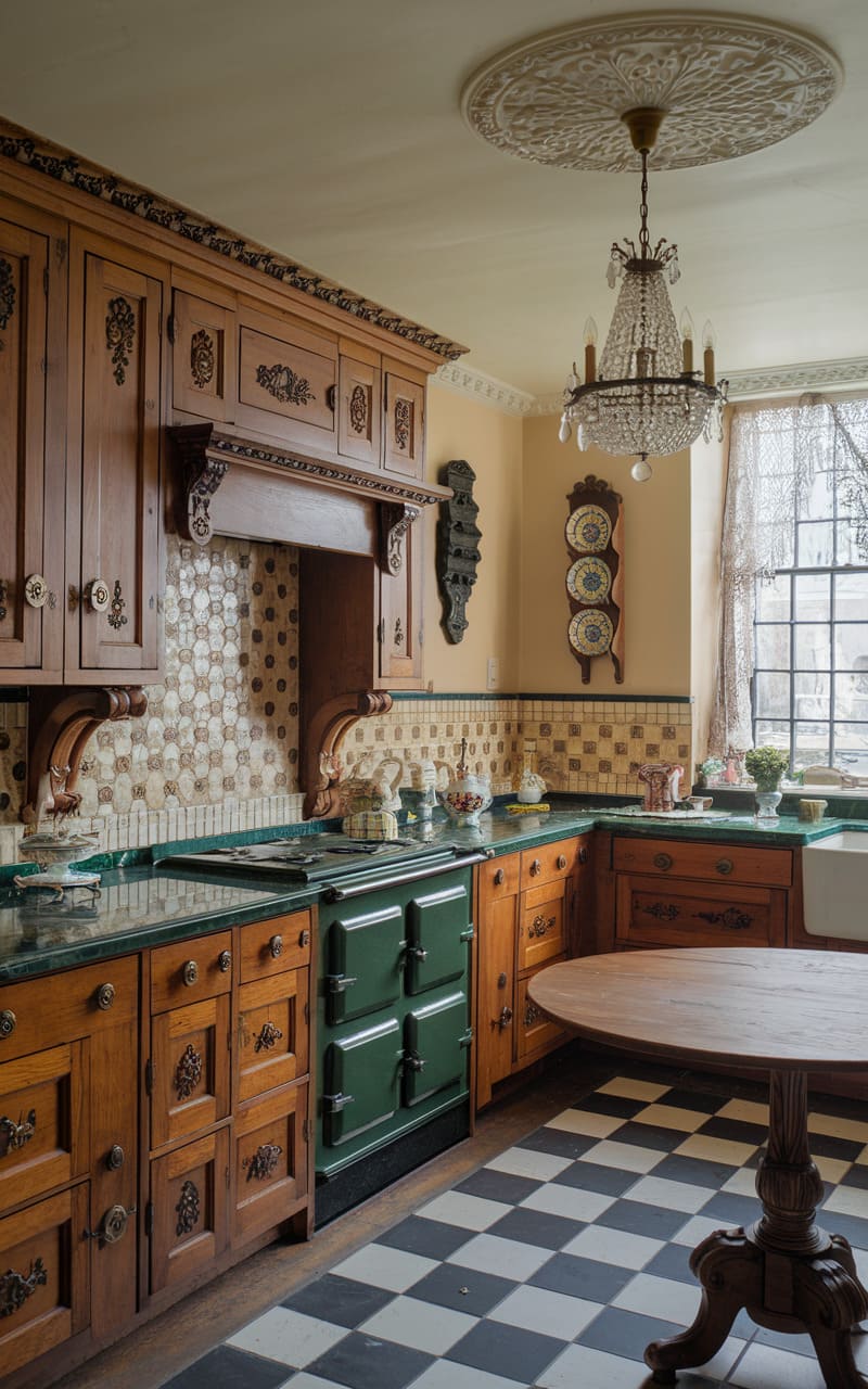 Elegant dark oak cabinets bring Victorian grandeur to this kitchen space. Intricate details, raised panels, and decorative carvings are characteristic of the style. Ornate hardware in brass or dark metal adds to the period feel. Rich colors on the walls or in a patterned backsplash complement the dark wood. Combining the cabinets with marble countertops enhances the luxurious aesthetic. This kitchen feels formal, detailed, and steeped in history.