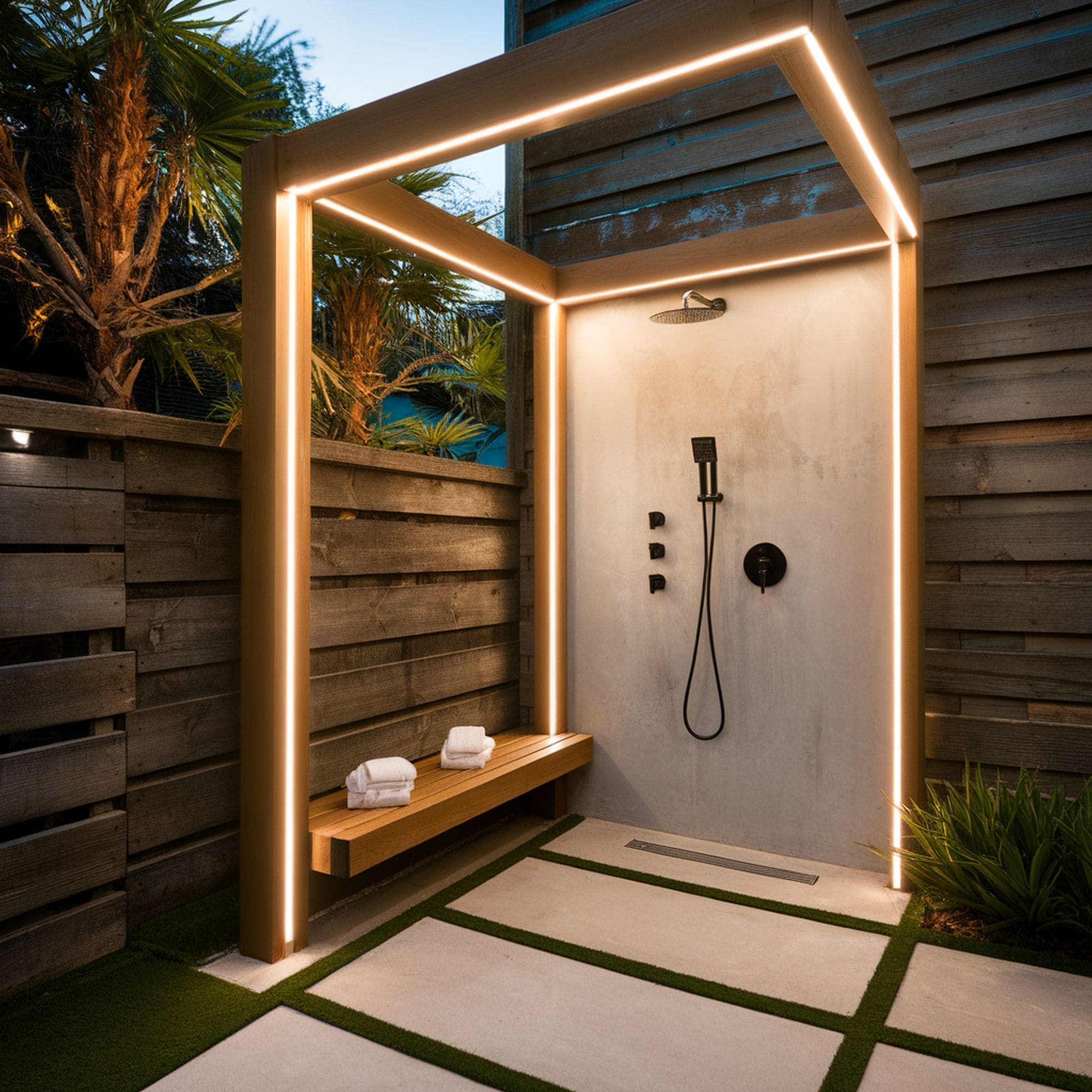 Enhance your outdoor shower using waterproof LED lights that add ambiance and style. Install LED tube lights around the frame of your shower structure or run them vertically in a parallel format. A great addition to a lit up outdoor shower is a water temperature controlled LED shower head which automatically changes light according to the water temperature. It creates a vibrant effect similar to a colorful water fountain that takes shower lighting to the next level.
