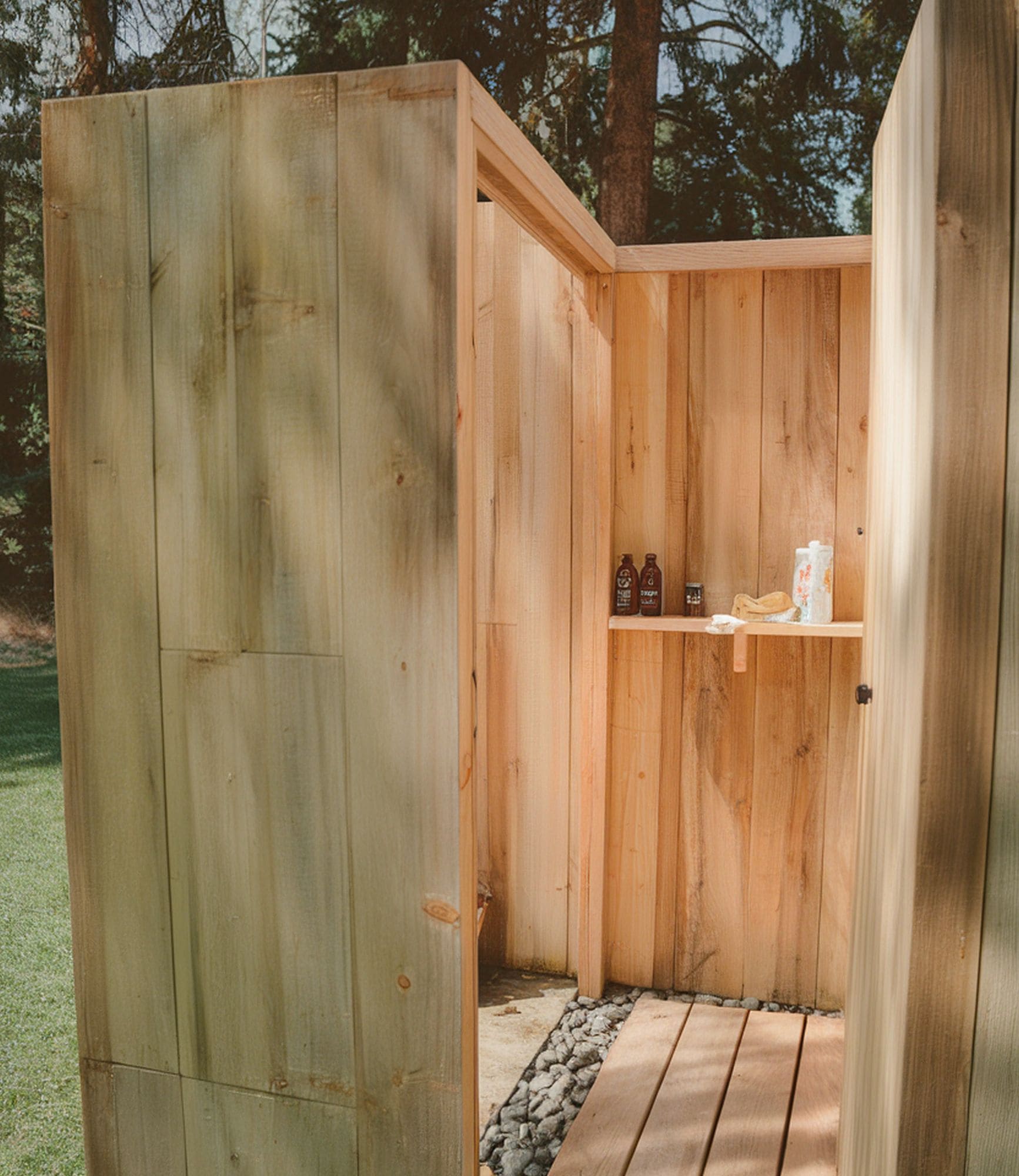 Start off by installing wooden beams into the ground. Make sure to use treated wood to help protect the shower from the weather, and connect the side panels to the wooden beams. Keep the side panels about mid-calf length so that the water can drain properly and finish the bottom surface with wooden slats. For added aesthetic, hang a fixture of your choice on the outside door and enjoy the camping shower vibe!