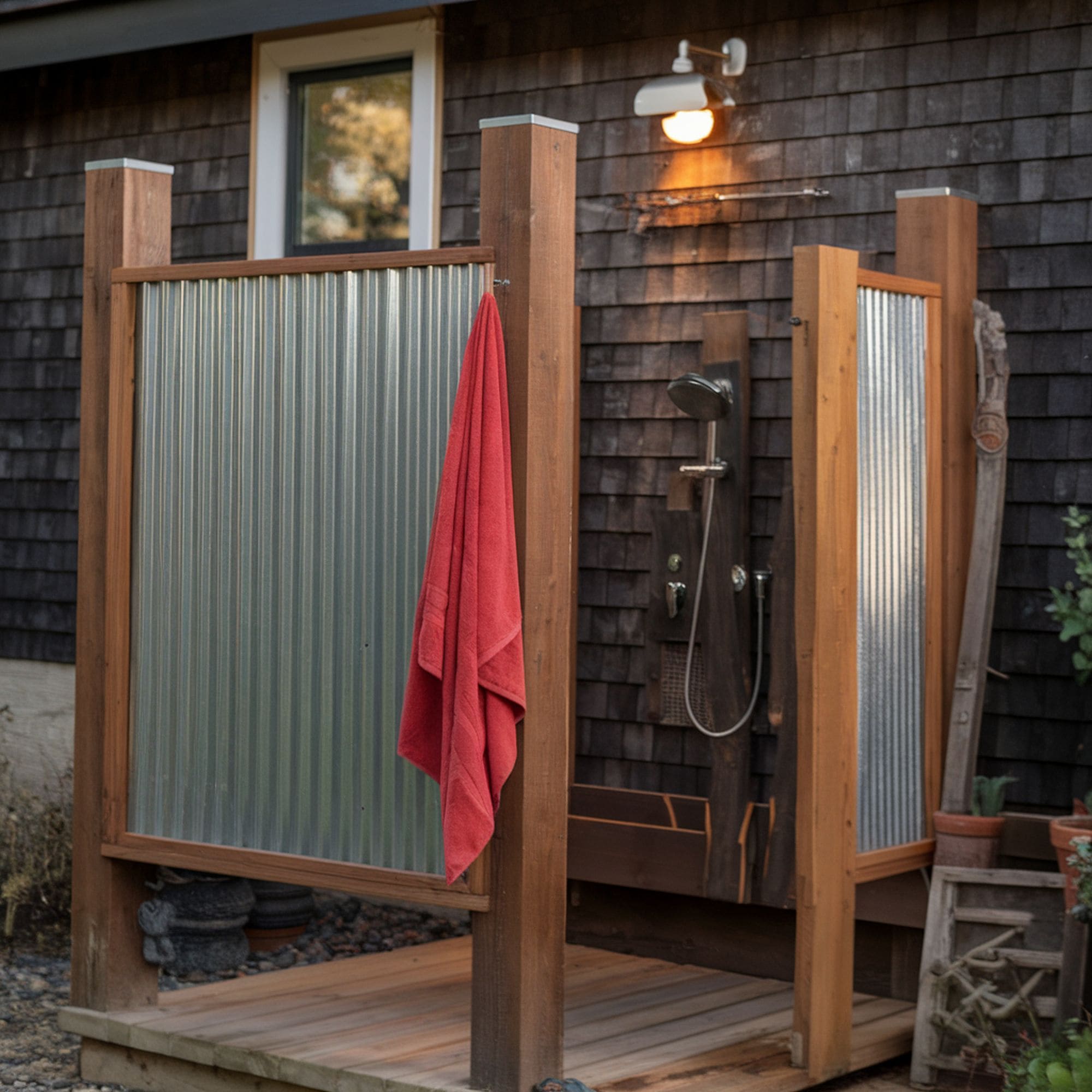 The refreshing sound of water droplets on a tin roof! Recreate the experience in the form of an outdoor shower with corrugated galvanized metal panels. Not only are they rust resistant, but they can easily be bolted into wood frames to give a rustic look. Join two panels together into an L-shaped structure or go with four panels to create a more private space.