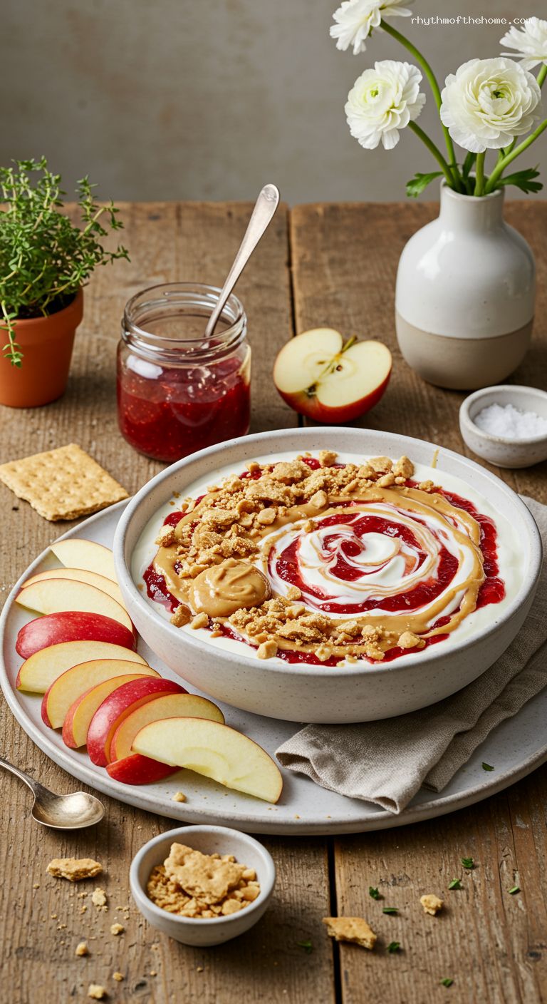Sprinkle the crushed graham crackers and chopped peanuts evenly over the top. Serve immediately with the apple slices for scooping. For extra indulgence, add a final tiny drizzle of peanut butter or a few micro dollops of jam.