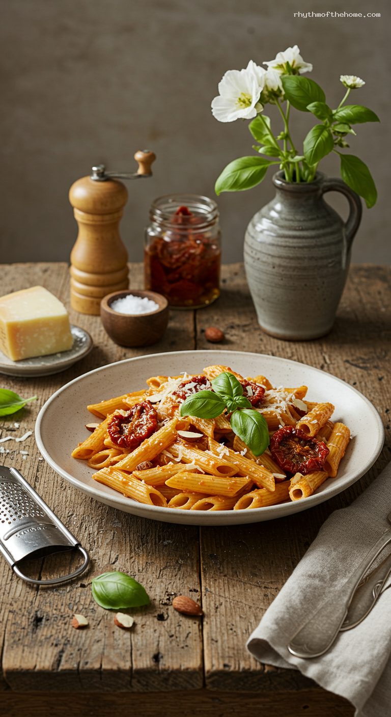 The pesto rosso can be made up to 5 days ahead; cover with a thin film of olive oil and refrigerate in an airtight jar. For longer storage, spoon into an ice cube tray and freeze up to 2 months; thaw in the fridge. Leftover dressed pasta keeps 2–3 days in the refrigerator; reheat gently with a splash of water on the stovetop over low heat until loosened and glossy.