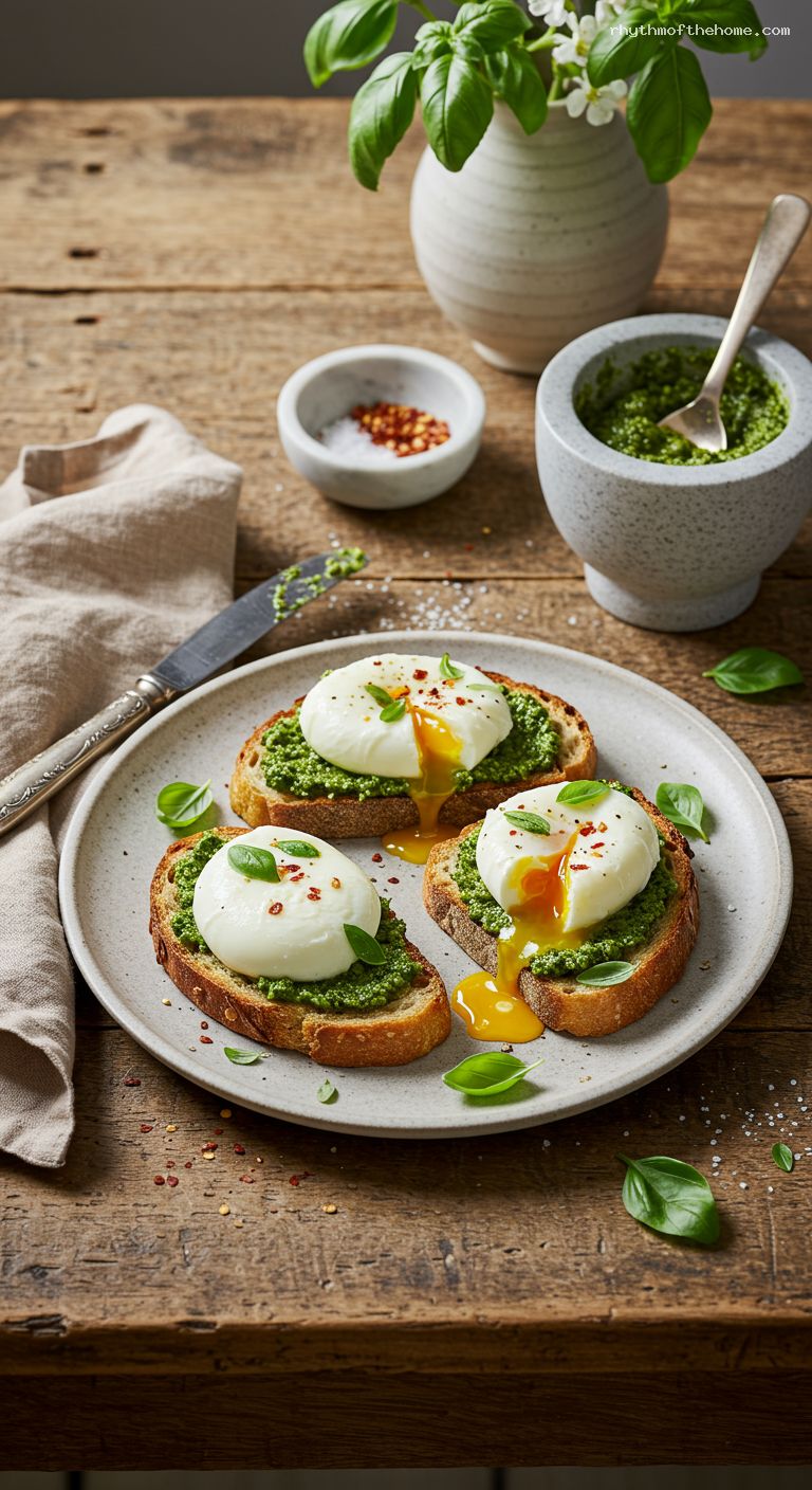 - Crusty toast soaks up yolk and pesto for a satisfying bite.