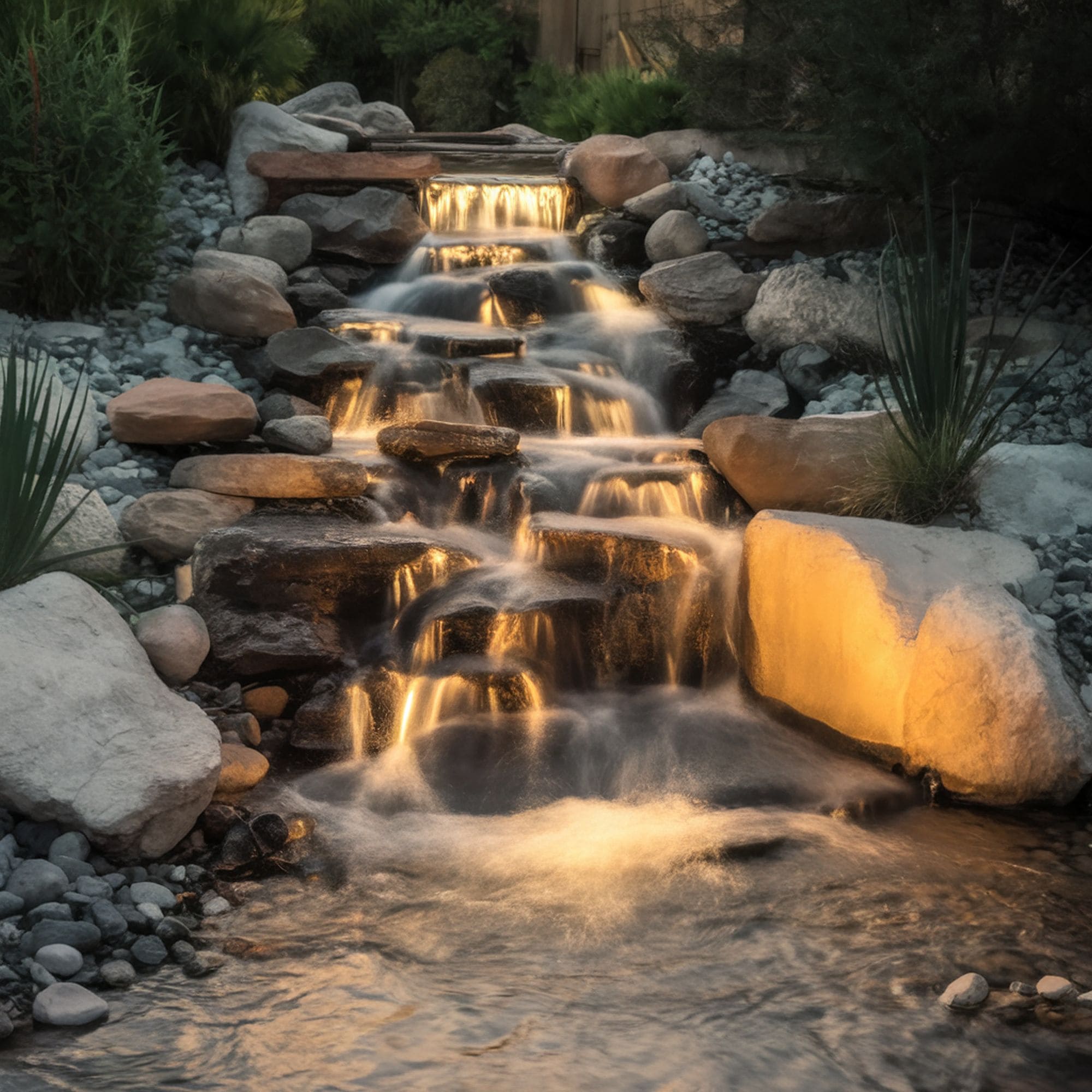 As artificial lighting can affect the aesthetic of a natural pond, it’s recommended to focus on materials like stone which can maintain a good balance in that regard. If ambient lighting doesn’t highlight the waterfall too well, consider having the pond closer to the house so it can benefit from patio illumination.