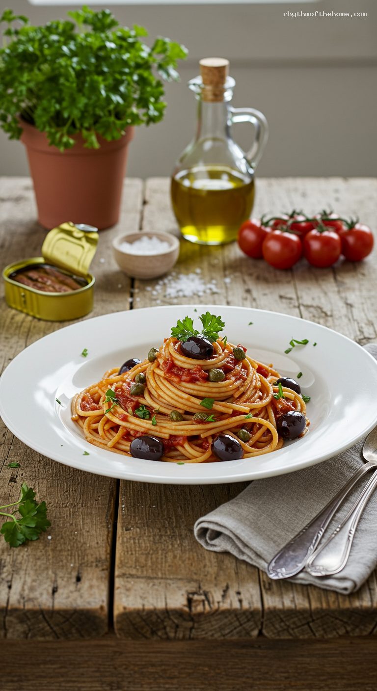 The sauce base (through Step 3) can be made up to 3 days ahead; cool and refrigerate in an airtight container. Reheat gently and proceed with Steps 4–7. Leftover dressed pasta keeps 2–3 days in the fridge; rewarm in a skillet over medium heat with a splash of water to loosen. Puttanesca is not ideal for freezing once combined with pasta, but the sauce alone freezes well for up to 2 months.