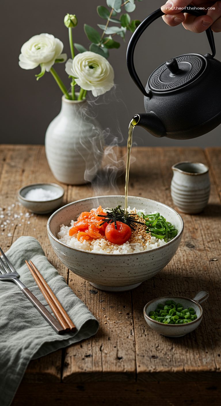 Pour 3/4–1 cup of hot green tea or seasoned dashi around (not directly onto) the rice in each bowl. Serve immediately while it’s steaming, and enjoy the soothing aromas. Add more nori or a splash of soy to taste.