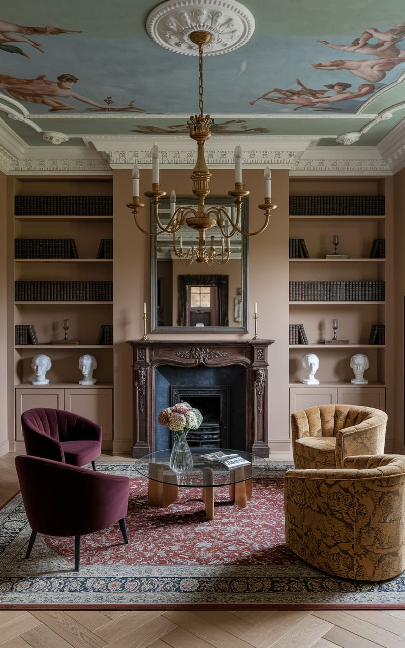 Sunlight barely penetrates the muted palette of this grand room, where Renaissance cherubs cavort across a frescoed sky-blue ceiling, their playful forms mirrored in the solemn symmetry of the space below. A gilded chandelier hangs like a frozen star above a tableau of plush armchairs and a glass-topped table, all anchored by a richly patterned rug that whispers tales of faded grandeur. The dark, ornate fireplace stands sentinel, flanked by shadowed bookshelves, each holding silent stories, while plaster busts gaze out with an air of timeless wisdom, creating a space that feels both lived-in and lifted from a forgotten era.