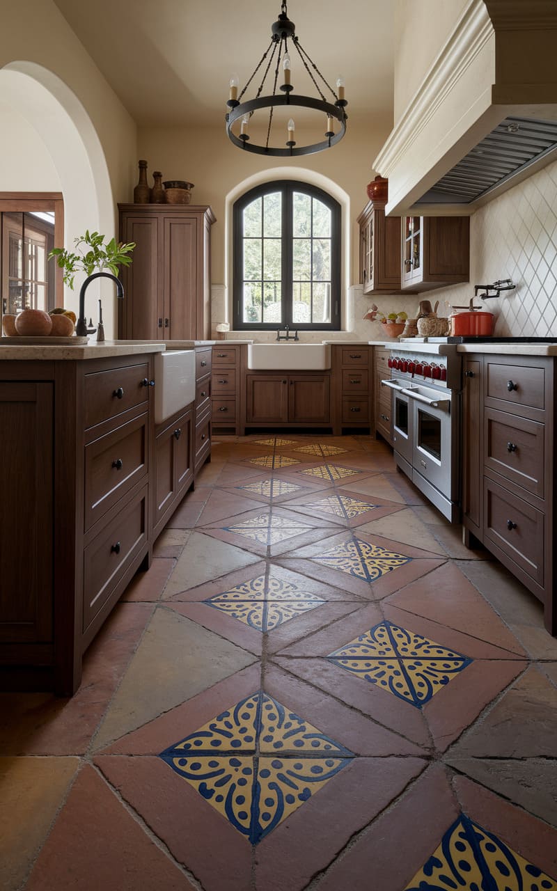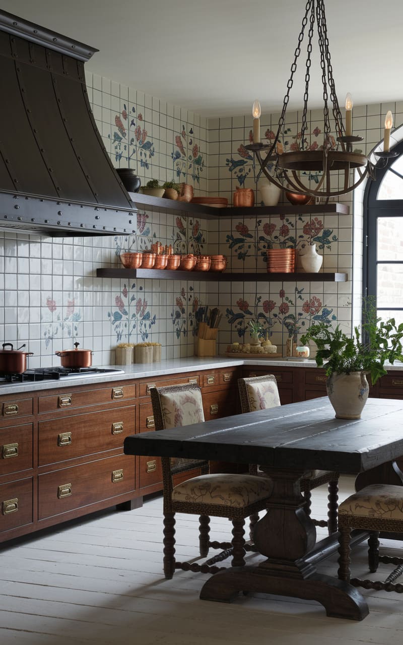 Sunlight barely breaches the arched window, casting a muted glow across the whitewashed floor of this kitchen where time seems to linger. A heavy, dark wood table anchors the space, its surface worn and whispering tales, while mismatched chairs invite a gathering. The walls, a tapestry of hand-painted florals on a grid of simple tiles, frame a dark, imposing range hood, a stark contrast to the glint of copper cookware lining the floating shelves. A rustic chandelier hangs heavy, a silent sentinel over a room that feels both lived-in and dreamlike, a stage set for a feast in a forgotten era.