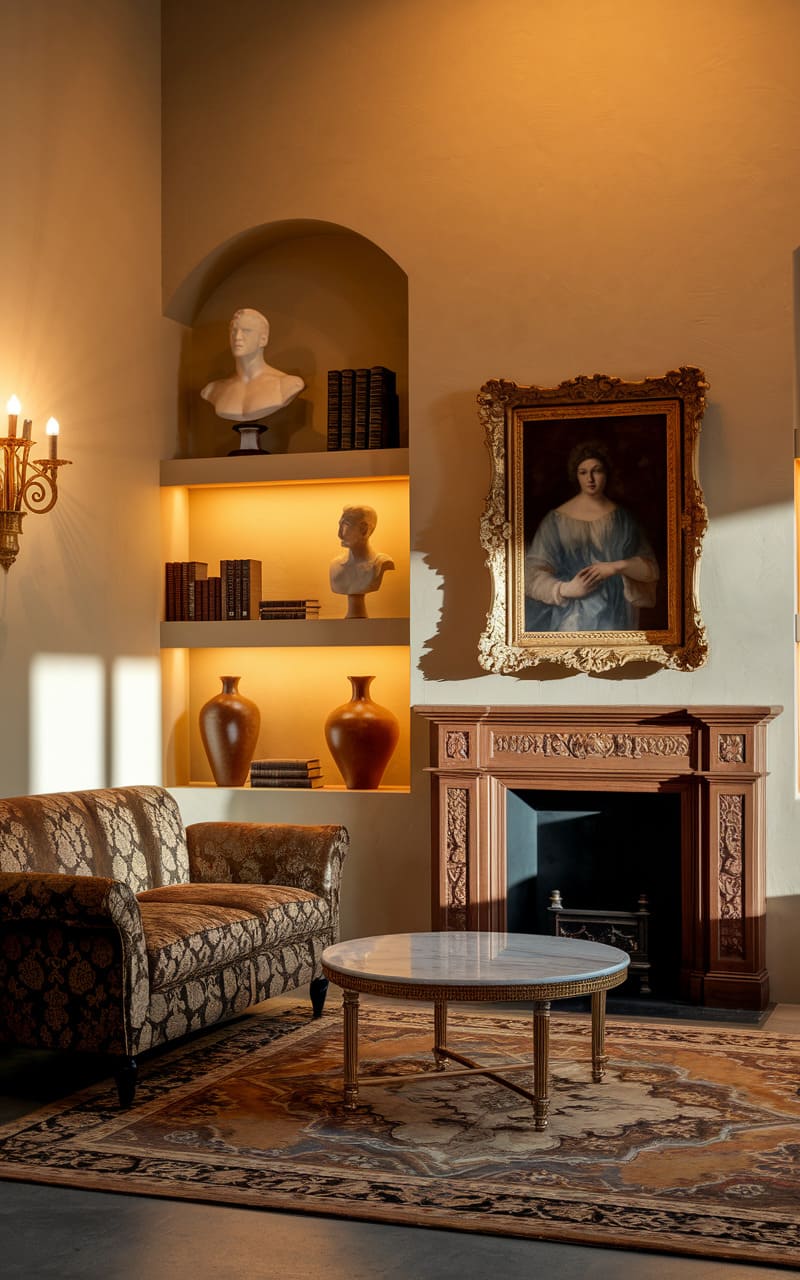 Bathed in a warm, buttery glow, this intimate parlor whispers of bygone elegance. A plush, patterned settee invites repose beside a marble-topped table, while a framed portrait gazes serenely over a carved mantel. Within a niche, illuminated shelves cradle busts and aged tomes, their silent stories adding to the room’s rich, almost palpable atmosphere. The air feels thick with the weight of history, a stage set for whispered secrets and quiet contemplation.