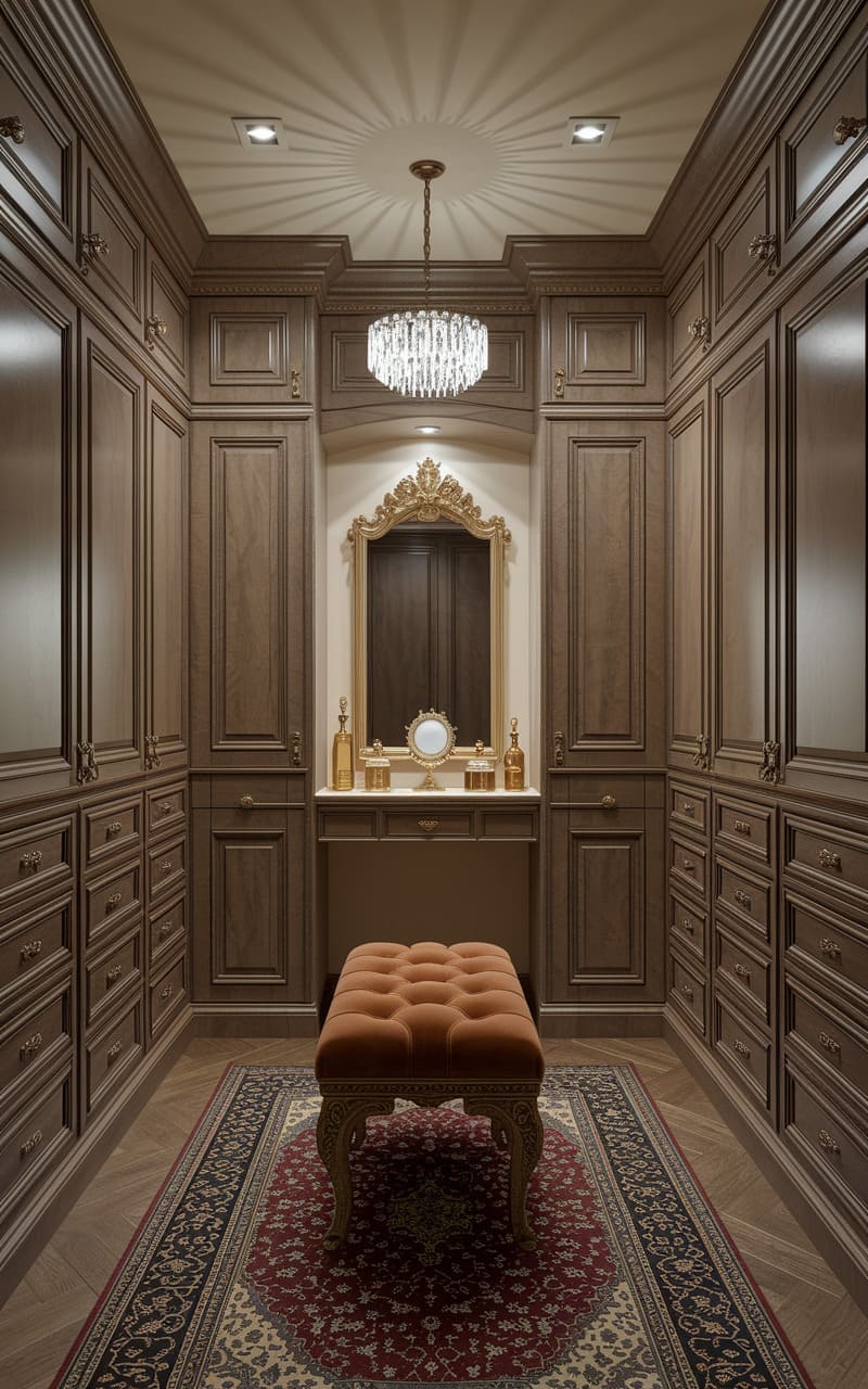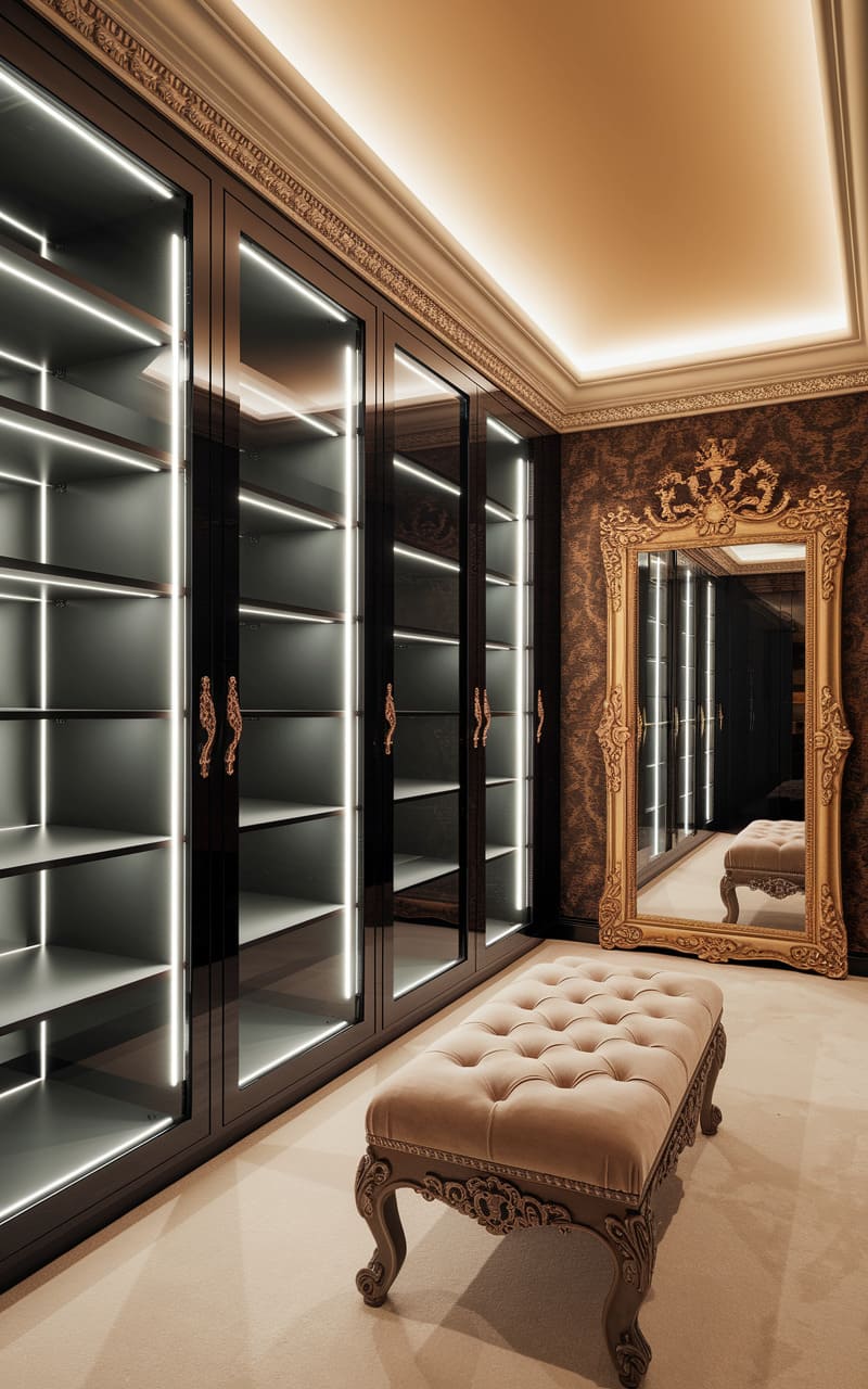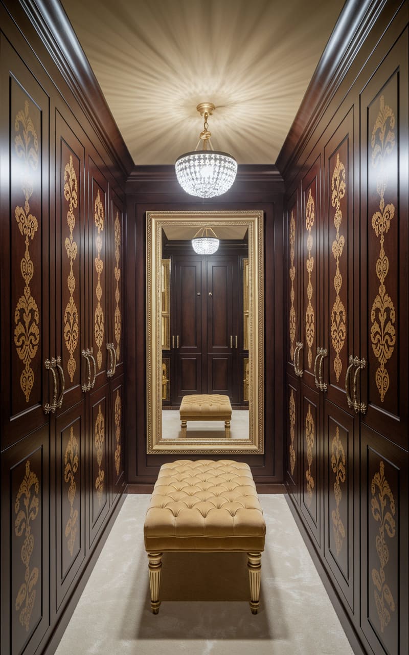139. Modern Walk-In Closet with Renaissance-Style Gilded Trim and Velvet Seating