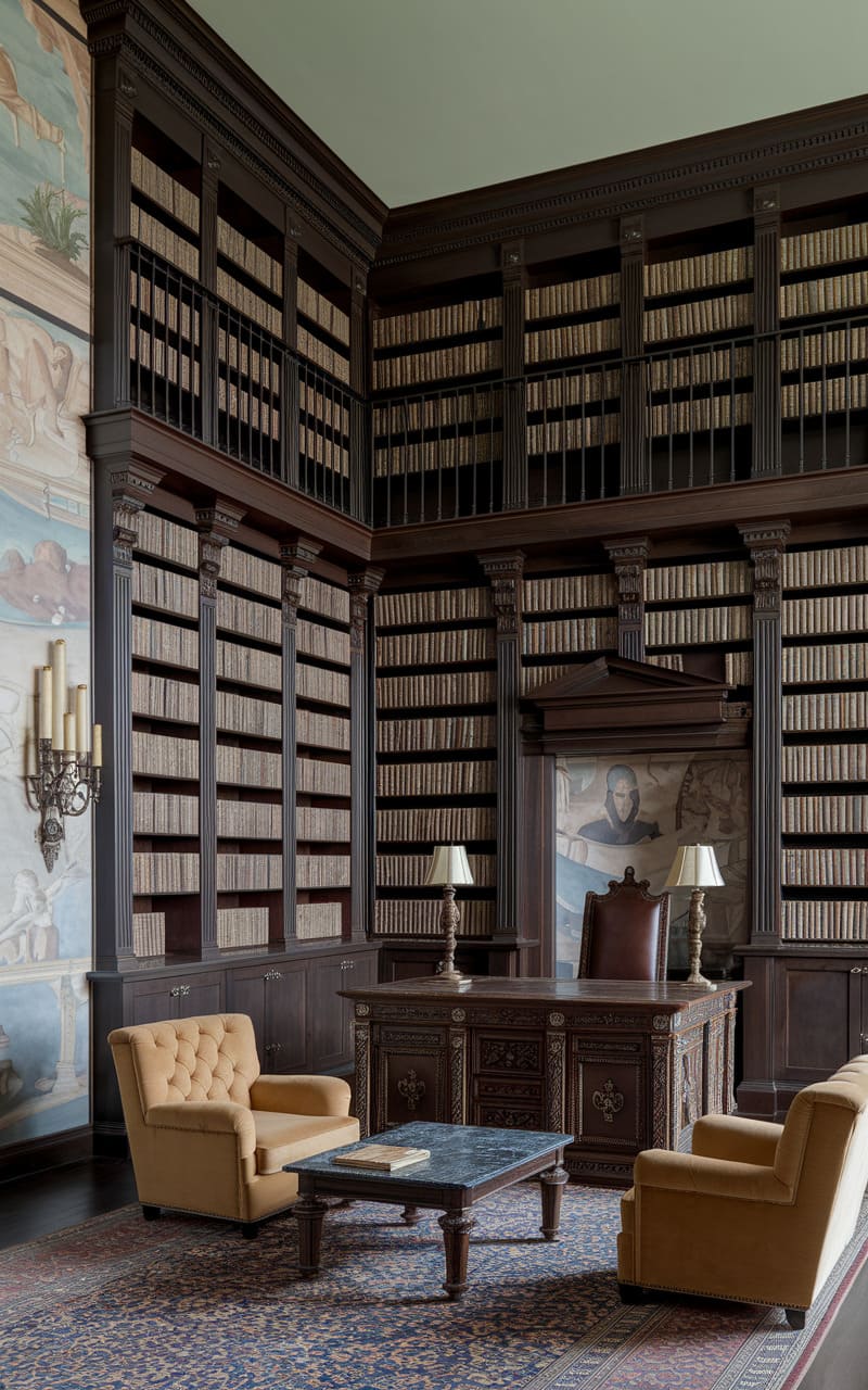 Imagine stepping into a scholar’s retreat, where towering walls of darkly stained wood, packed with aged tomes, loom like silent sentinels of knowledge. Two plush, butterscotch-colored armchairs flank a low table, hinting at hushed conversations and contemplative hours spent beneath the watchful gaze of a portrait nestled within the central bookcase. The air feels thick with the weight of history, and the pale, almost ethereal mural on the far wall suggests a world beyond the well-worn rug and the soft glow of the lamps on the ornate desk.